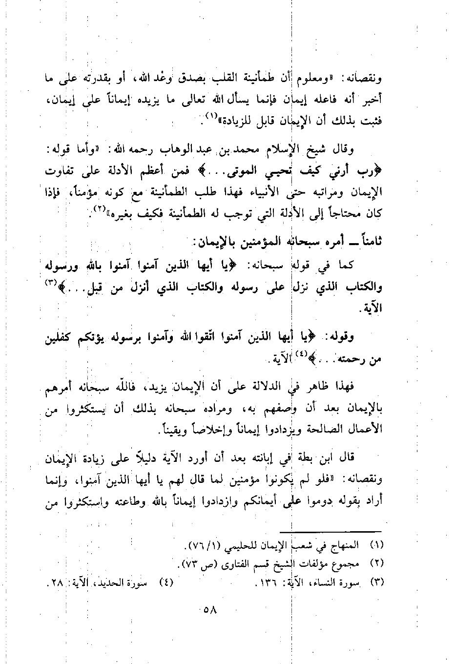 وقال شيخ الإسلام محمد بن عبد الوهاب رحمه الله: (وأما قوله: {رَبِّ أَرِنِي كَيْفَ تُحْيِي الْمَوْتَى ... } فمن أعظم الأدلة على تفاوت الإيمان ومراتبه حتى الأنبياء فهذا طلب الطمأنينة مع كونه مؤمناً، فإذا كان محتاجاً إلى الأدلة التي توجب له الطمأنينة فكيف بغيره"2.