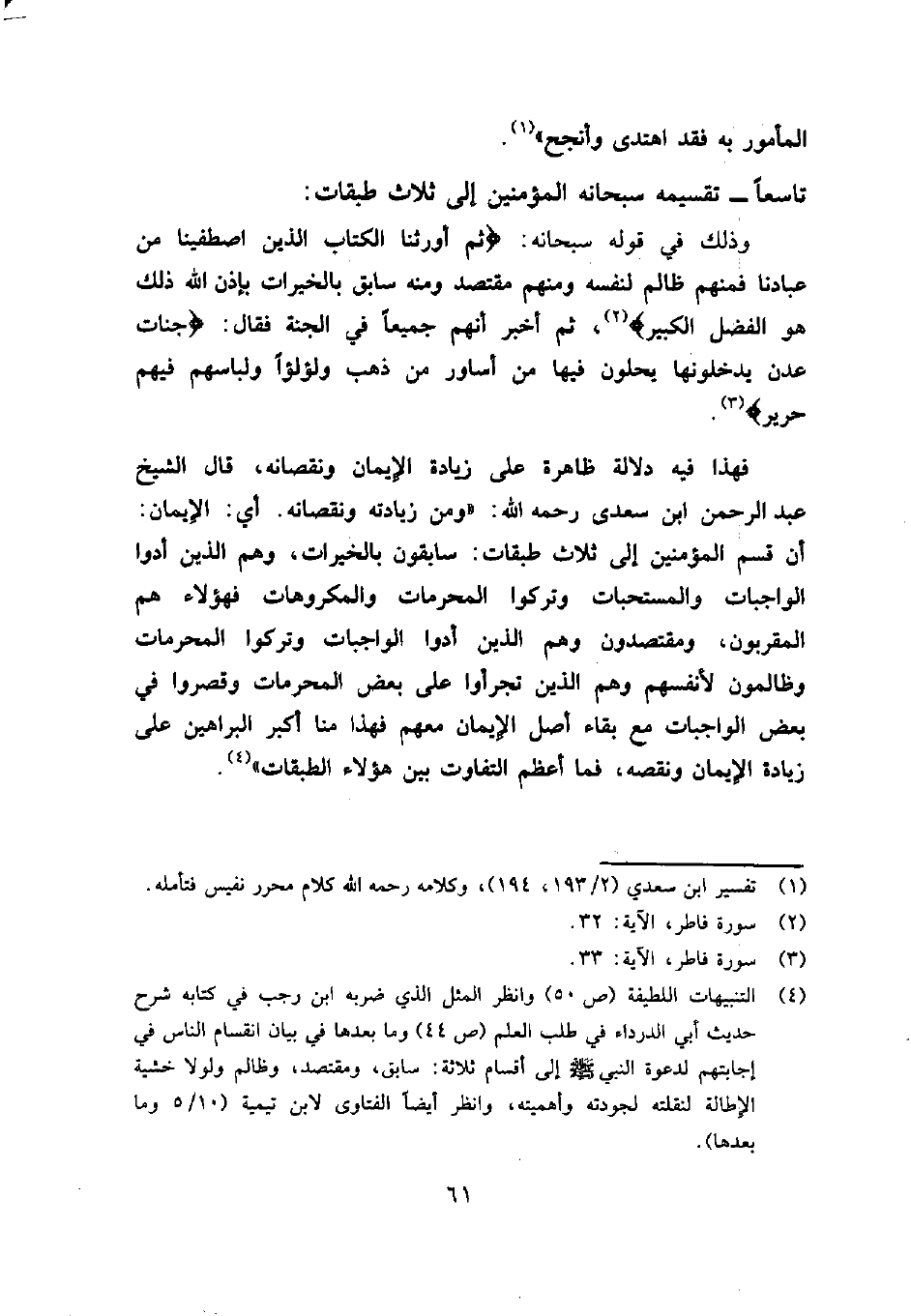 فهذا فيه دلالة ظاهرة على زيادة الإيمان ونقصانه، قال الشيخ عبد الرحمن ابن سعدى رحمه الله:"ومن زيادته ونقصانه. أي: الإيمان: أن قسم المؤمنين إلى ثلاث طبقات: سابقون بالخيرات، وهم الذين أدوا الواجبات والمستحبات وتركوا المحرمات والمكروهات فهؤلاء هم المقربون، ومقتصدون وهم الذين أدوا الواجبات وتركوا المحرمات وظالمون لأنفسهم وهم الدين تجرأوا على بعضي المحرمات وقصروا في بعض الواجبات مع بقاء أصل الإيمان معهم فهذا منا أكبر البراهين على زيادة الإيمان ونقصه، فما أعظم التفاوت بين! هؤلاء الطبقات"4.
