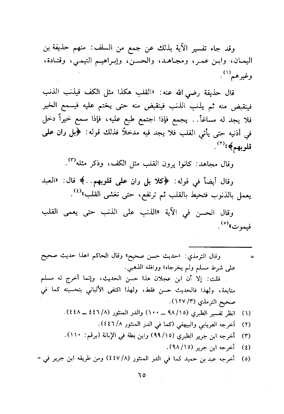 وقال أيضاً في قوله: {كَلاَّ بَلْ رَانَ عَلَى قُلُوبِهِمْ ... } قال:"العبد يعمل بالذنوب فتحيط بالقلب ثم ترتفع، حتى تغشى القلب"4.