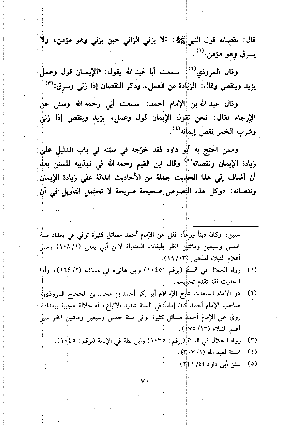 وقال عبد الله بن الإمام أحمد: سمعت أبي رحمه الله وسئل عن الإرجاء فقال: نحن نقول الإيمان قول وعمل، يزيد وينقص إذا زنى وضرب الخمر نقص إيمانه4.