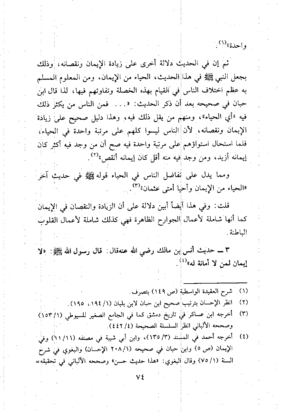 4 أخرجه أحمد في المسند (3/ 135) ، وابن أبي شيبة في مصنفه (11/11) وفي الإيمان (ص 5) وابن حبان في صحيحه (1/ 208 الإحسان) والبغوي في شرح السنة (1/ 75) وقال البغوي:"هذا حديث حسن وصححه الألباني في تحقيقه للإيمان لابن أبي شيبة.