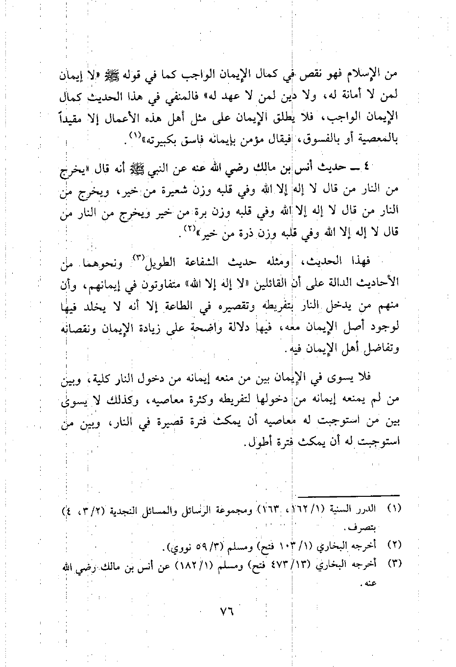 4- حديث أنس بن مالك رضي الله عنه عن النبي صلى الله عليه وسلم أنه قال "يخرج من النار من قال لا إله إلا الله وفي قلبه وزن شعيرة من خير، ويخرج من النار من قال لا إله إلا الله وفي قلبه وزن برة من خير وبخرج من النار من قال لا إله إلا الله وفي قلبه وزن ذرة من خير" 2.
