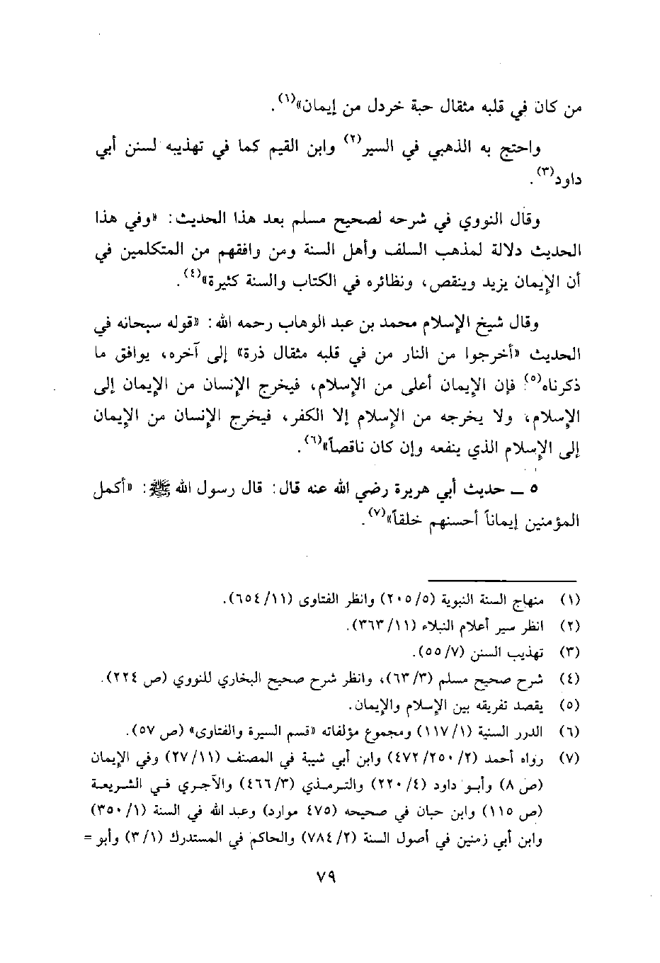 7 رواه أحمد (2/250/ 472) وابن أبي شيبة في المصنف (11/27) وفي الإيمان (ص 8) وأبو داود (4/220) والترمذي (3/ 466) والآجري في الشريعة (ص 115) وابن حبان في صحيحه (475 موارد) وعبد الله في السنة (1/350) وابن أبي زمنين في أصول السنة (2/784) والحاكم في المستدرك (1/3) وأبو نعيم في الحلية (9/248) وابن عبد البر في التمهيد (9/237) والبيهقي في الشعب (1/161) وفي الاعتقاد (ص 118) والذهبي في السير (12/206) من طرق عن أبي هريرة رضي الله عنه وقال الترمذي:"حديث حسن صحيح"، وصححه الحاكم والذهبي، والألباني في سلسلة الأحاديث الصحيحة (1/511) ، وله شواهد كثيرة.