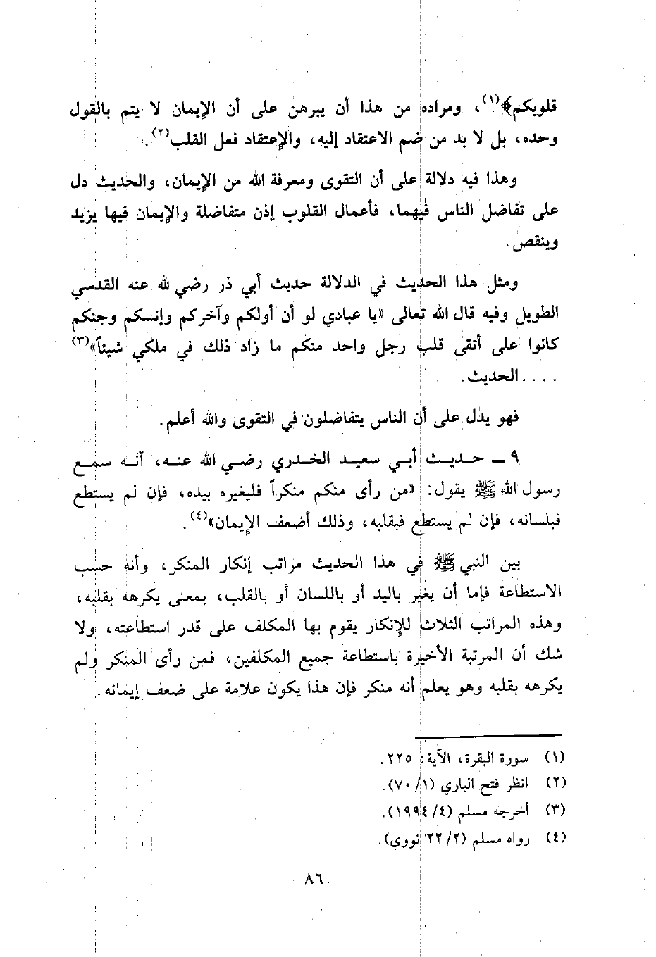 9- حديث أبي سعيد الخدري رضي الله عنه، أنه سمع رسول الله صلى الله عليه وسلم يقول:"من رأى منكم منكراً فليغيره بيده، فإن لم يستطع فبلسانه، فإن لم يستطع فبقلبه، وذلك أضعف الإيمان" 4.