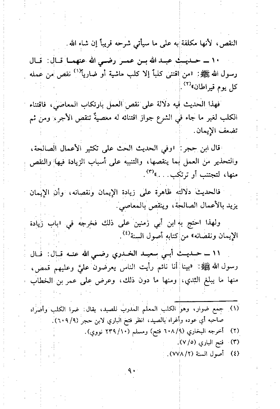 10- حديث عبد الله بن عمر رضي الله عنهما قال: قال رسول الله صلى الله عليه وسلم:"من اقتنى كلباً إلا كلب حاشية أو ضارياً1 نقص من عمله كل يوم قيراطان" 2.