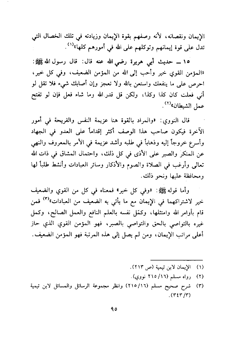 15- حديث أبي هريرة رضي الله عنه قال: قال رسول الله صلى الله عليه وسلم:"المؤمن القوي خير وأحب إلى الله من المؤمن الضعيف، وفي كل خير، احرص على ما ينفعك واستعن بالله ولا تعجز وإن أصابك شيء فلا تقل لو أني فعلت كان كذا وكذا، ولكن قل قدر الله وما شاء فعل فإن لو تفتح عمل الشيطان" 2.