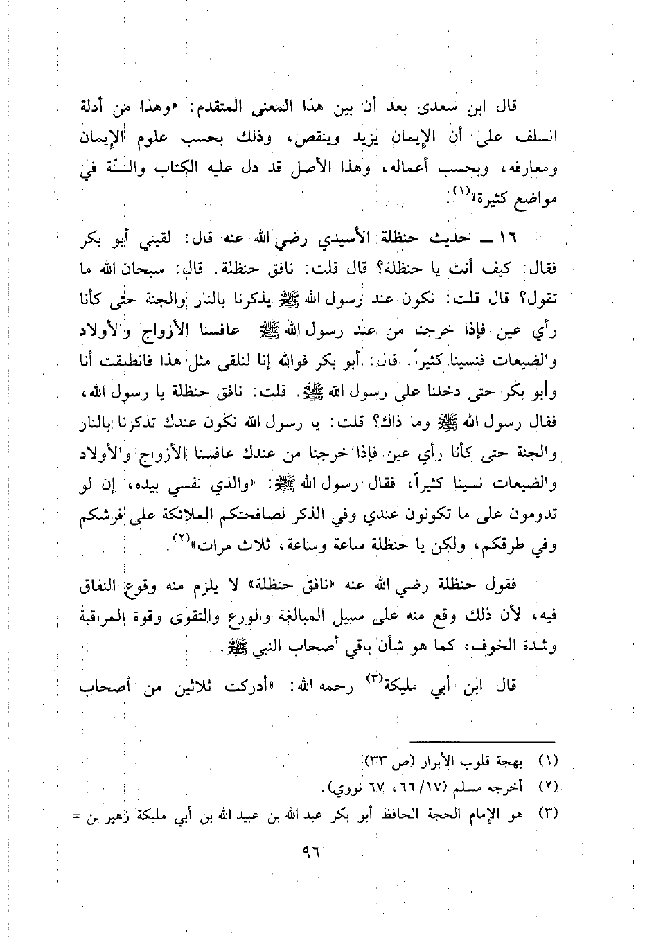 16- حديث حنظلة الأسدي رضي الله عنه قال: لقيني أبو بكر فقال: كيف أنت يا حنظلة؟ قال قلت: نافق حنظلة. قال: سبحان الله ما تقول؟ قال قلت: نكون عند رسول الله صلى الله عليه وسلم يذكرنا بالنار والجنة حتى كأنا رأي عين فإذا خرجنا من عند رسول الله صلى الله عليه وسلم عافسنا الأزواج والأولاد والضيعات فنسينا كثيراً. قال: أبو بكر فوالله إنا لنلقى مثل هذا فانطلقت أنا وأبو بكر حتى دخلنا على رسول الله صلى الله عليه وسلم. قلت: نافق حنظلة يا رسول الله، فقال رسول الله صلى الله عليه وسلم وما ذاك؟ قلت: يا رسول الله نكون عندك تذكرنا بالنار والجنة حتى كأنا رأي عين فإذا خرجنا من عندك عافسنا الأزواج والأولاد والضيعات نسينا كثيراً، فقال رسول الله صلى الله عليه وسلم:"والذي نفسي بيده، إن لو تدومون على ما تكونون عندي وفي الذكر لصافحتكم الملائكة على فرشكم وفي طرقكم، ولكن يا حنظلة ساعة وساعة، ثلاث مرات" 2.