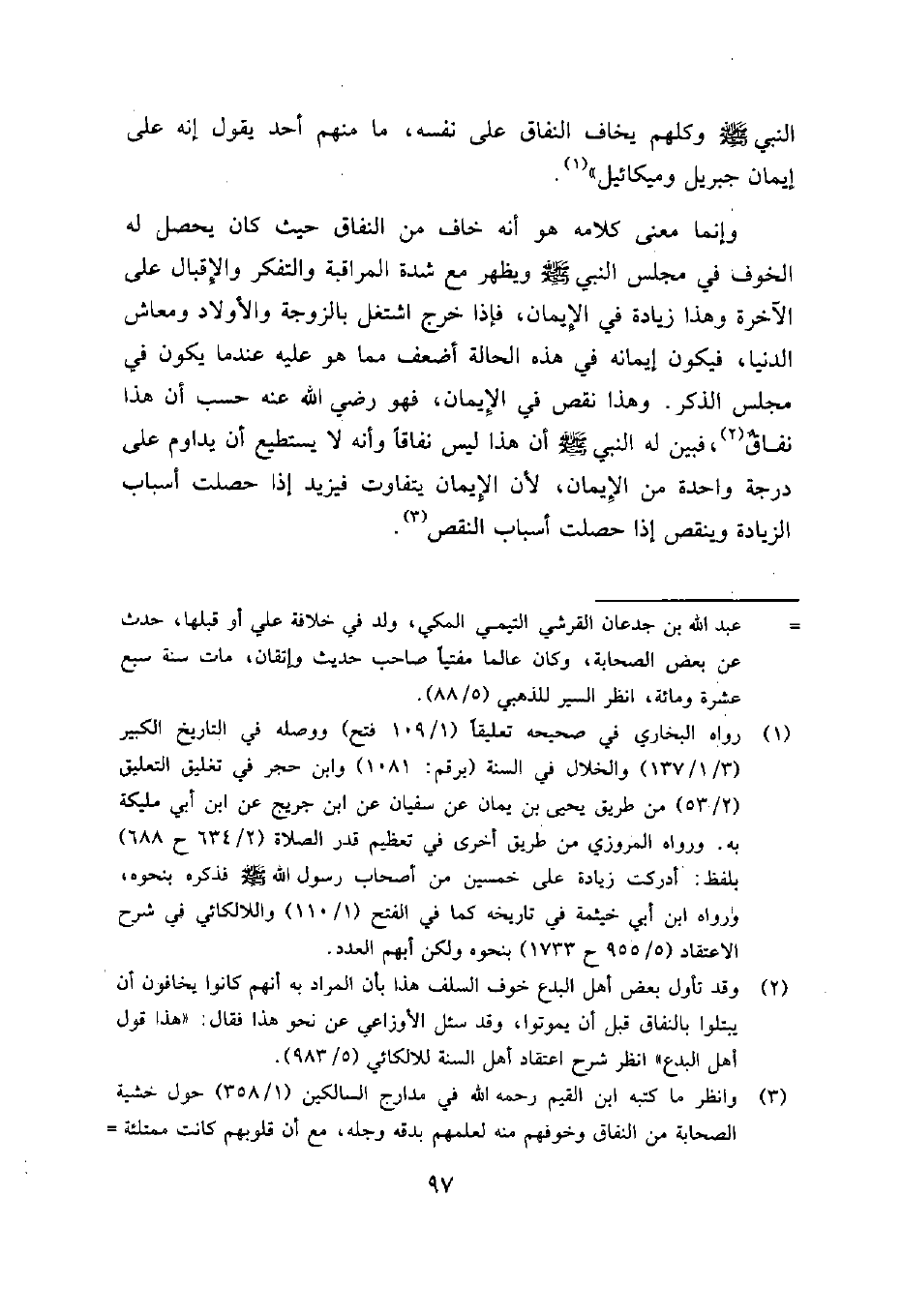 3 وانظر ما كتبه ابن القيم رحمه الله في مدارج السالكين (1/358) حول خشية الصحابة من النفاق وخوفهم منه لعلمهم بدقه وجله، مع أن قلوبهم كانت ممتلئة إيماناً بخلاف غيرهم ممن لا يجاوز الإيمان حناجرهم، ويظنون أنهم أكمل الناس إيماناً.