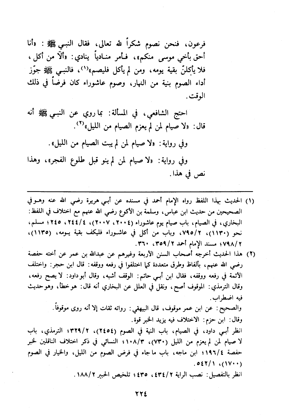 انظر أبي داود، في الصيام، باب النية في الصوم (2454)، 2/ 329؛ الترمذي، باب لا صيام لمن لم يعزم من الليل (730)، 3/ 108؛ النسائي في ذكر اختلاف الناقلين لخبر حفصة 4/ 196؛ ابن ماجه، باب ما جاء في فرض الصوم من الليل، والخيار في الصوم (1700)، 1/ 542.