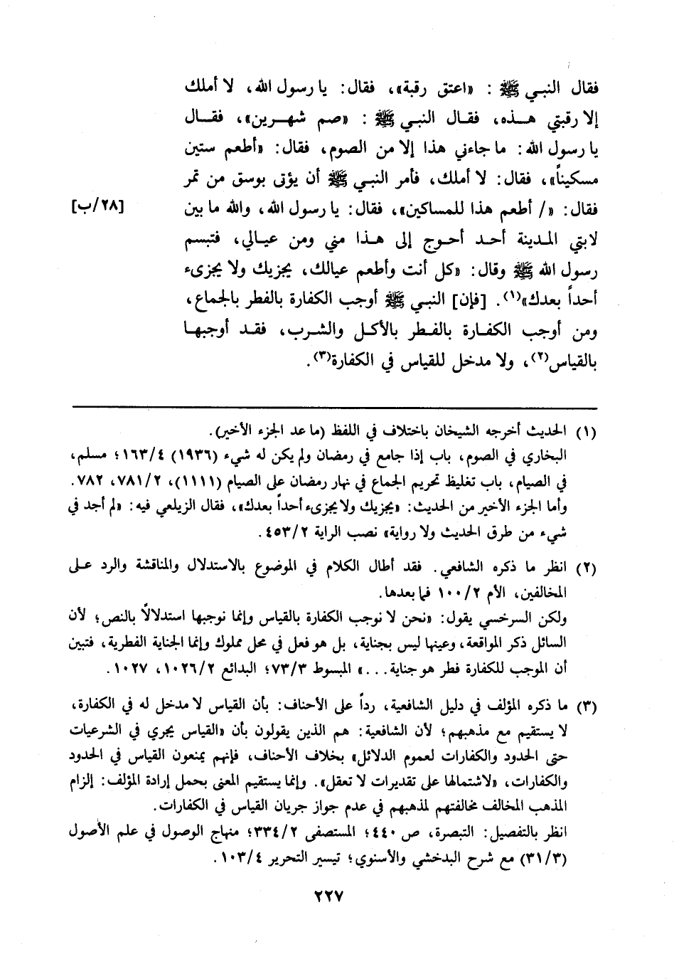 ولكن السرخسي يقول: "نحن لا نوجب الكفارة بالقياس وإنما نوجبها استدلالًا بالنص؛ لأن السائل ذكر المواقعة، وعينها ليس بجناية، بل هو فعل في محل مملوك وإنما الجناية الفطرية، فتبين أن الموجب للكفارة فطر هو جناية .. ." المبسوط 3/ 73؛ البدائع 2/ 1026، 1027.