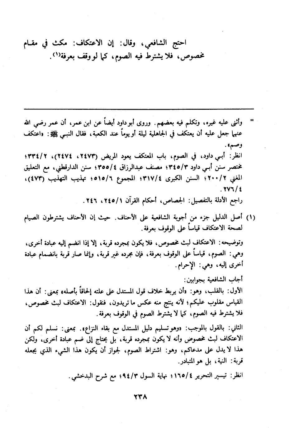 (¬1) أصل الدليل جزء من أجوبة الشافعية على الأحناف. حيث إن الأحناف يشترطون الصيام لصحة الاعتكاف قياسًا على الوقوف بعرفة.