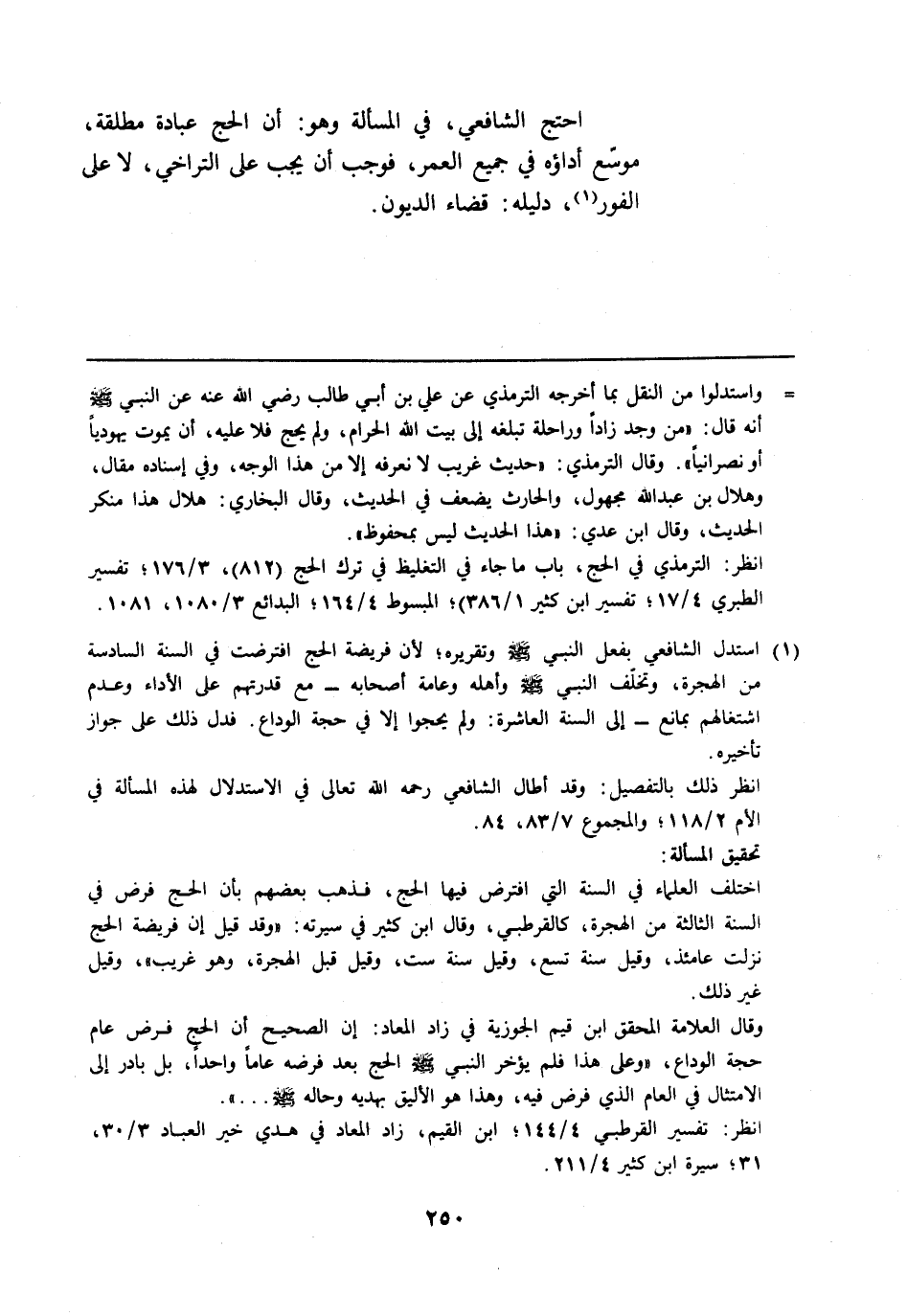 (¬1) استدل الشافعي بفعل النبي - صلى الله عليه وسلم - وتقريره؛ لأن فريضة الحج افترضت في السنة السادسة من الهجرة، وتخلّف النبي - صلى الله عليه وسلم - وأهله وعامة أصحابه - مع قدرتهم على الأداء وعدم اشتغالهم بمانع - إلى السنة العاشرة: ولم يحجوا إلا في حجة الوداع. فدل ذلك على جواز تأخيره.