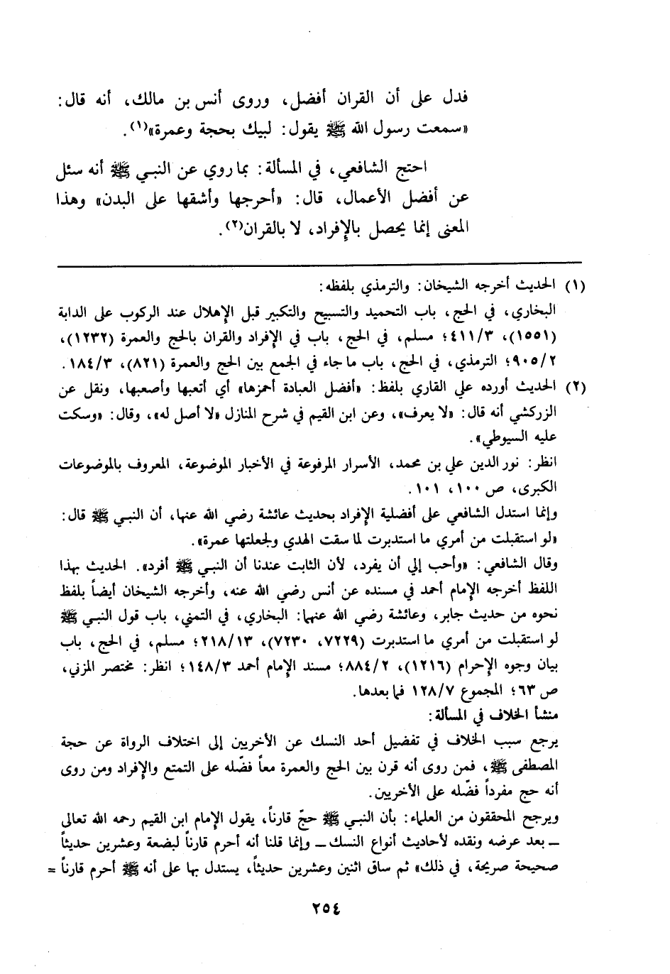 احتج الشافعي، في المسألة: بما روي عن النبي - صلى الله عليه وسلم - أنه سئل عن أفضل الأعمال، قال: "أحرجها وأشقها على البدن" وهذا المعنى إنما يحصل بالِإفراد، لا بالقران (¬2).