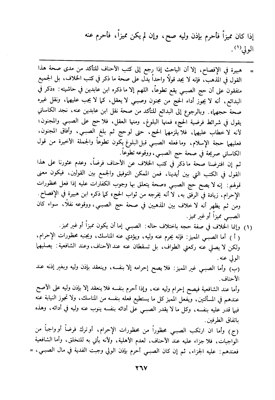 = هبيرة في الإفصاح، إلا أن الباحث إذا رجع إلى كتب الأحناف للتأكد من مدى صحة هذا القول في المذهب، فإنه لا يجد قولًا واحدًا يدل على صحة ما ذكر في كتب الخلاف، بل الجميع متفقون على أن حج الصبي يقع تطوعًا، اللهم إلا ما ذكره ابن عابدين في حاشيته: "ذكر في البدائع، أنه لا يجوز أداء الحج من مجنون وصبي لا يعقل، كما لا يجب عليهما، ونقل غيره صحة حجهما". وبالرجوع إلى البدائع للتأكد من صحة نقل ابن عابدين عنه، نجد الكاساني يقول في شرائط فرضية الحج" فمنها البلوغ، ومنها العقل، فلا حج على الصبي والمجنون؛ لأنه لا خطاب عليهما، فلا يلزمهما الحج، حتى لو حج ثم بلغ الصبي، وأفاق المجنون، فعليهما حجة الإسلام، وما فعله الصبي قبل البلوغ يكون تطوعًا والجملة الأخيرة من قول الكاساني صريحة في صحة حج الصبي، ووقوعه تطوعًا.