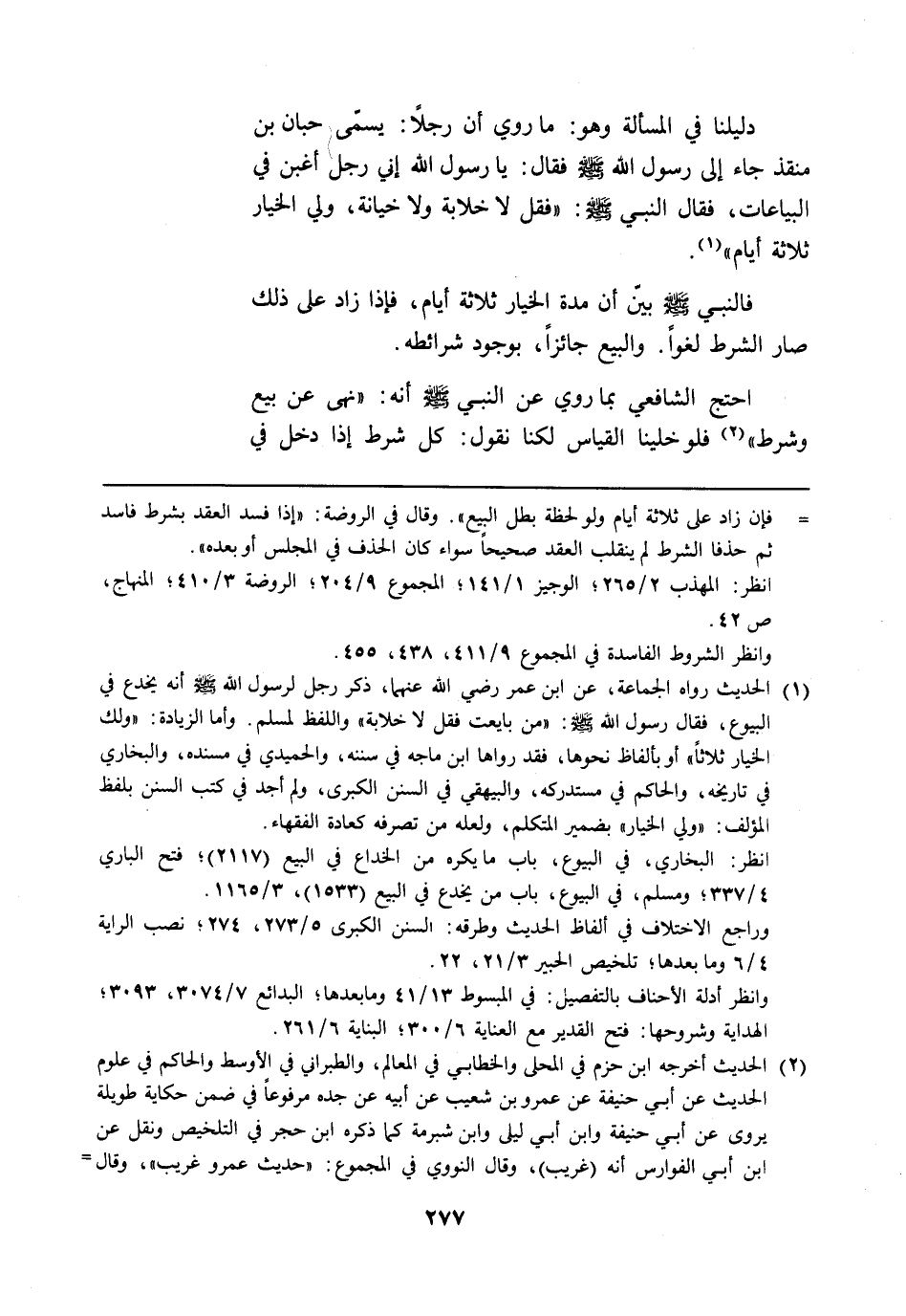 (¬1) الحديث رواه الجماعة، عن ابن عمر رضي الله عنهما، ذكر رجل لرسول الله - صلى الله عليه وسلم - أنه يخدع في البيوع، فقال رسول الله - صلى الله عليه وسلم -: "من بايعت فقل لا خلابة" واللفظ لمسلم. وأما الزيادة: "ولك الخيار ثلاثًا" أو بألفاظ نحوها، فقد رواها ابن ماجه في سننه، والحميدي في مسنده، والبخاري في تاريخه، والحاكم في مستدركه، والبيهقي في السنن الكبرى، ولم أجد في كتب السنن بلفظ المؤلف: "ولي الخيار" بضمير المتكلم، ولعله من تصرفه كعادة الفقهاء.