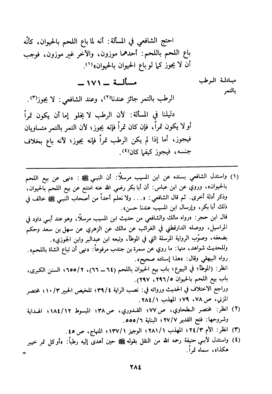 (¬1) واستدل الشافعي بسنده عن ابن المسيب مرسلًا: أن النبي - صلى الله عليه وسلم -: "نهى عن بيع اللحم بالحيوان"، وروي عن ابن عباس: أن أبا بكر رضي الله عنه امتنع عن بيع اللحم بالحيوان، وذكر أدلة أخرى. ثم قال الشافعي: " ... ولا نعلم أحدًا من أصحاب النبي - صلى الله عليه وسلم - خالف في ذلك أبا بكر، وإرسال ابن المسيب عندنا حسن".