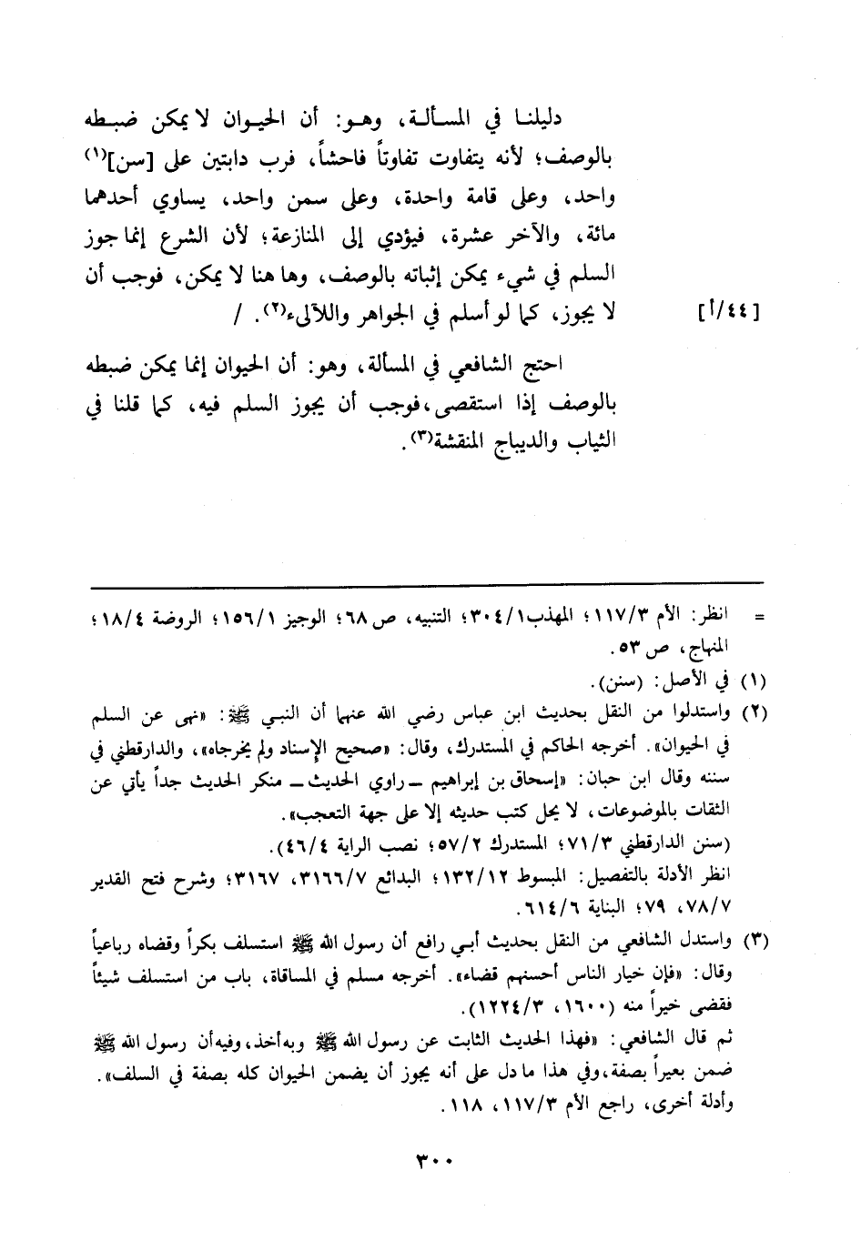 احتج الشافعي في المسألة، وهو: أن الحيوان إنما يمكن ضبطه بالوصف إذا استقصى، فوجب أن يجوز السلم فيه، كما قلنا في الثياب والديباج المنقشة (¬3).