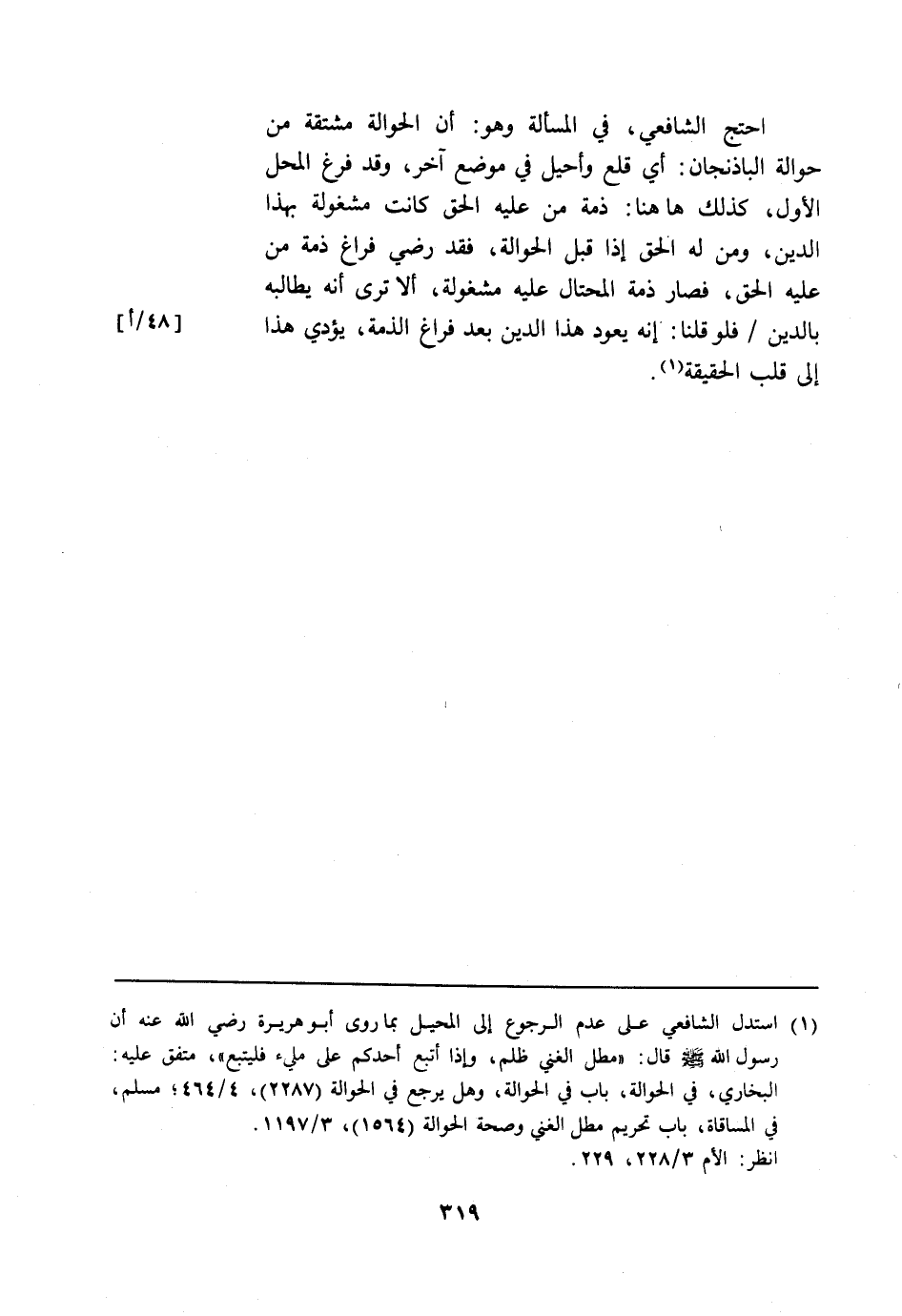 (¬1) استدل الشافعي على عدم الرجوع إلى الحيل بما روى أبو هريرة رضي الله عنه أن رسول الله - صلى الله عليه وسلم - قال: "مطل الغني ظلم، وإذا أتبع أحدكم على مليء فليتبع"، متفق عليه: البخاري، في الحوالة، باب في الحوالة، وهل يرجع في الحوالة (2287)، 4/ 464؛ مسلم، في المساقاة، باب تحريم مطل الغني وصحة الحوالة (1564)، 3/ 1197.