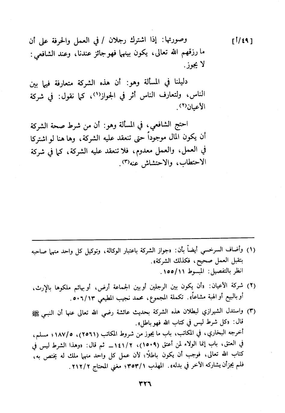 (¬3) واستدل الشيرازي لبطلان هذه الشركة بحديث عائشة رضي الله تعالى عنها أن النبي - صلى الله عليه وسلم - قال: "كل شرط ليس في كتاب الله فهو باطل".