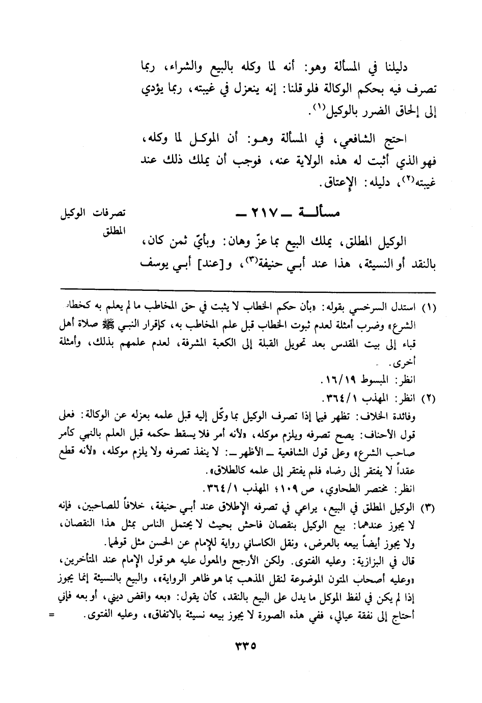 قال في البزازية: وعليه الفتوى. ولكن الأرجح والمعول عليه هو قول الإمام عند المتأخرين، "وعليه أصحاب المتون الموضوعة لنقل المذهب بما هو ظاهر الرواية"، والبيع بالنسيئة إنما يجوز إذا لم يكن في لفظ الموكل ما يدل على البيع بالنقد، كأن يقول: "بعه واقض ديني، أو بعه فإني أحتاج إلى نفقة عيالي، ففي هذه الصورة لا يجوز بيعه نسيئة بالاتفاق"، وعليه الفتوى. =
