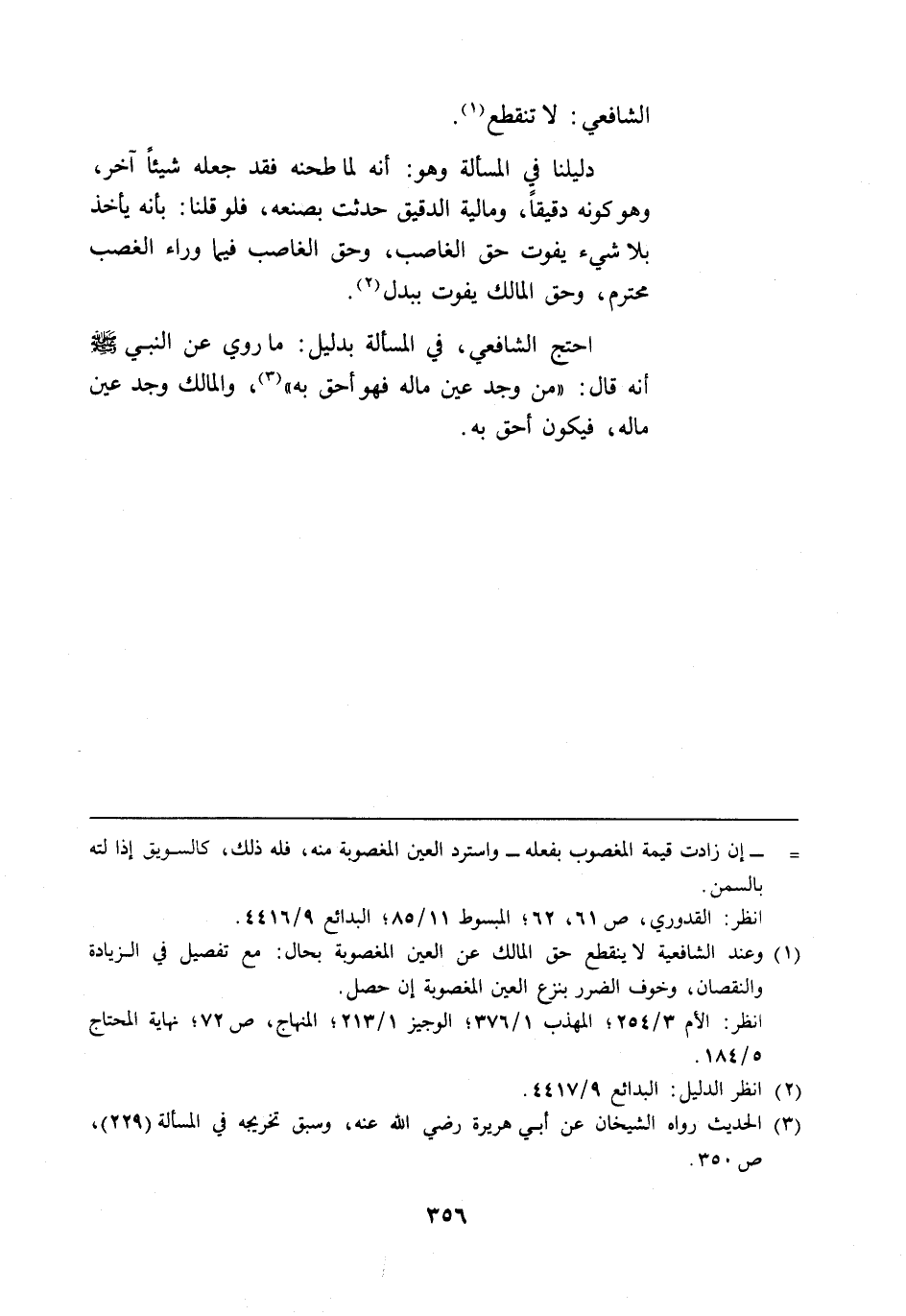(¬1) وعند الشافعية لا ينقطع حق المالك عن العين المغصوبة بحال: مع تفصيل في الزيادة والنقصان، وخوف الضرر بنزع العين المغصوبة إن حصل.