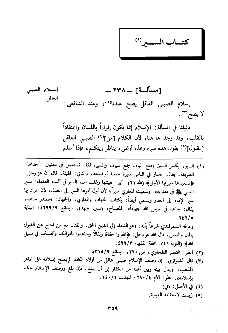 (¬3) قال الشيرازي: إن وصف الإسلام صبي عاقل من أولاد الكفار لم يصح إسلامه على ظاهر المذهب، ويحال بينه وبين أهله من الكفار إلى أن يبلغ، فإن بلغ ووصف الإسلام حكم بإسلامه" انظر: الأم 4/ 290؛ المهذب 2/ 240.