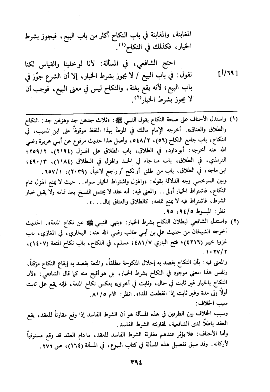(¬2) واستدل الشافعي لبطلان النكاح بشرط الخيار: "بنهي النبي - صلى الله عليه وسلم - عن نكاح المتعة". الحديث أخرجه الشيخان من حديث علي بن أبي طالب رضي الله عنه: البخاري، في المغازي، باب غزوة خيبر (4216)، فتح الباري 7/ 481؛ مسلم، في النكاح، باب نكاح المتعة (1407)، 2/ 1027.