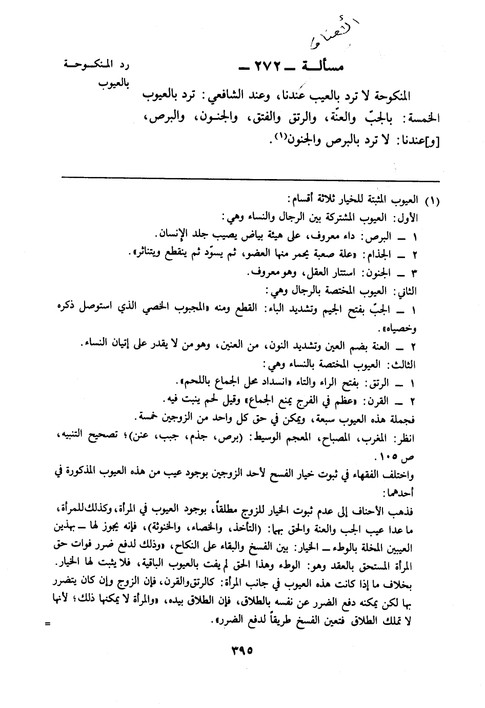 المنكوحة لا ترد بالعيب عندنا، وعند الشافعي: ترد بالعيوب الخمسة: بالجبّ والعنّة، والرتق والفتق، والجنون، والبرص، [و] عندنا: لا ترد بالبرص والجنون (¬1).