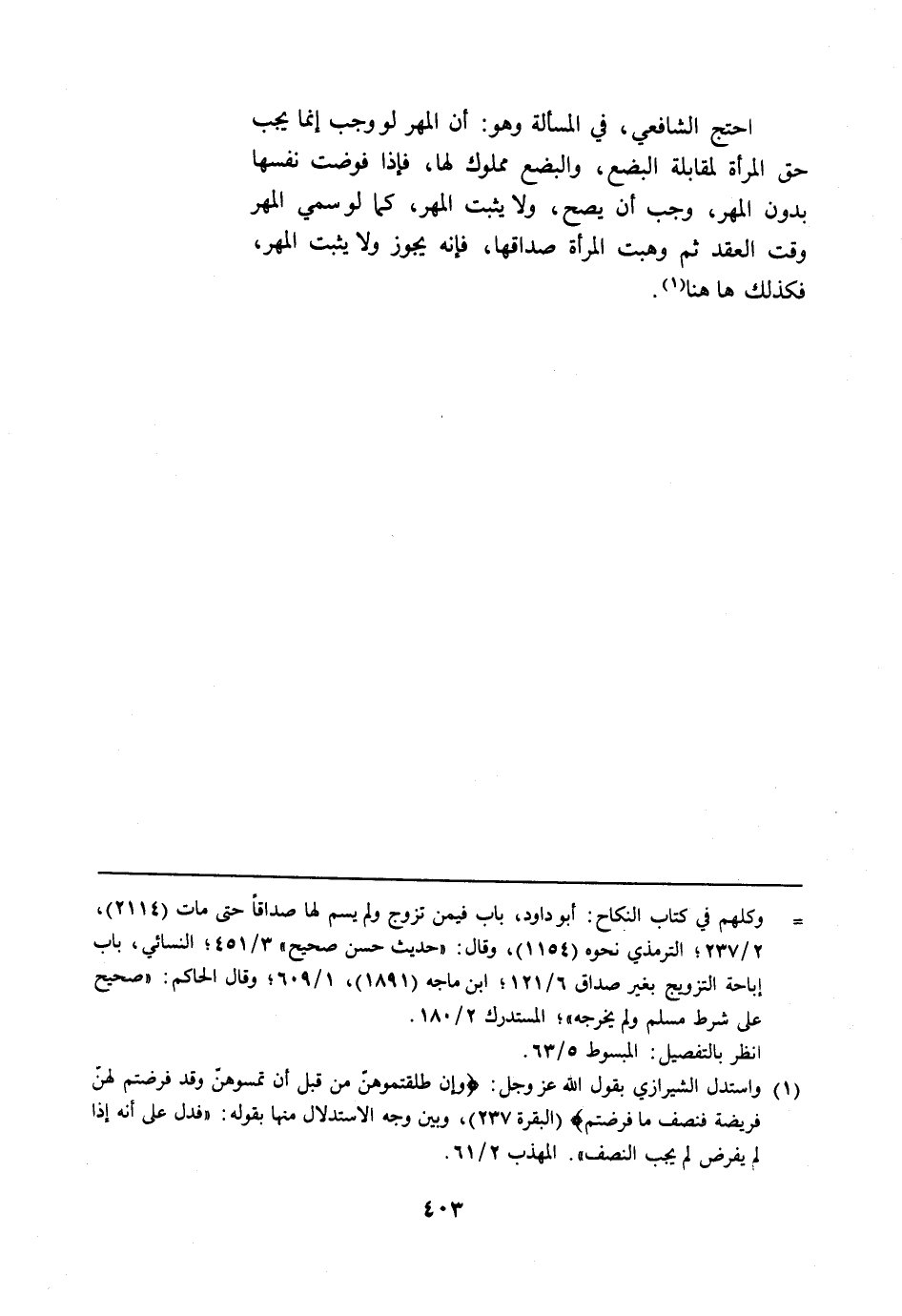 (¬1) واستدل الشيرازي بقول الله عز وجل: {وَإِنْ طَلَّقْتُمُوهُنَّ مِنْ قَبْلِ أَنْ تَمَسُّوهُنَّ وَقَدْ فَرَضْتُمْ لَهُنَّ فَرِيضَةً فَنِصْفُ مَا فَرَضْتُمْ} [البقرة: 237]، وبين وجه الاستدلال منها بقوله: "فدل على أنه إذا لم يفرض لم يجب النصف". المهذب 2/ 61.