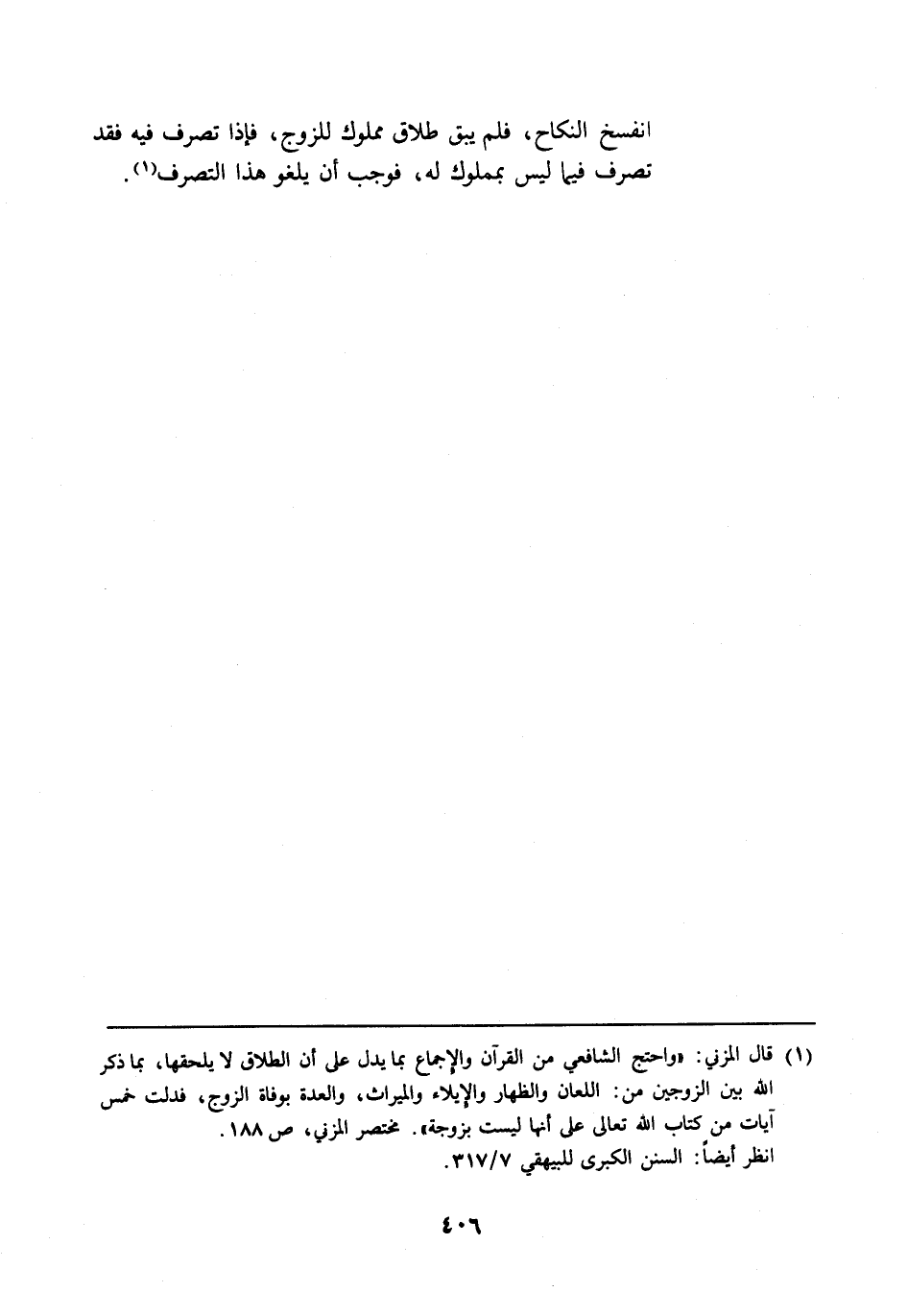 (¬1) قال المزني: "واحتج الشافعي من القرآن والإجماع بما يدل علي أن الطلاق لا يلحقها، بما ذكر الله بين الزوجين من: اللعان والظهار والإيلاء والميراث، والعدة بوفاة الزوج، فدلت خمس آيات من كتاب الله تعالى علي أنها ليست بزوجة". مختصر المزني، ص 188.