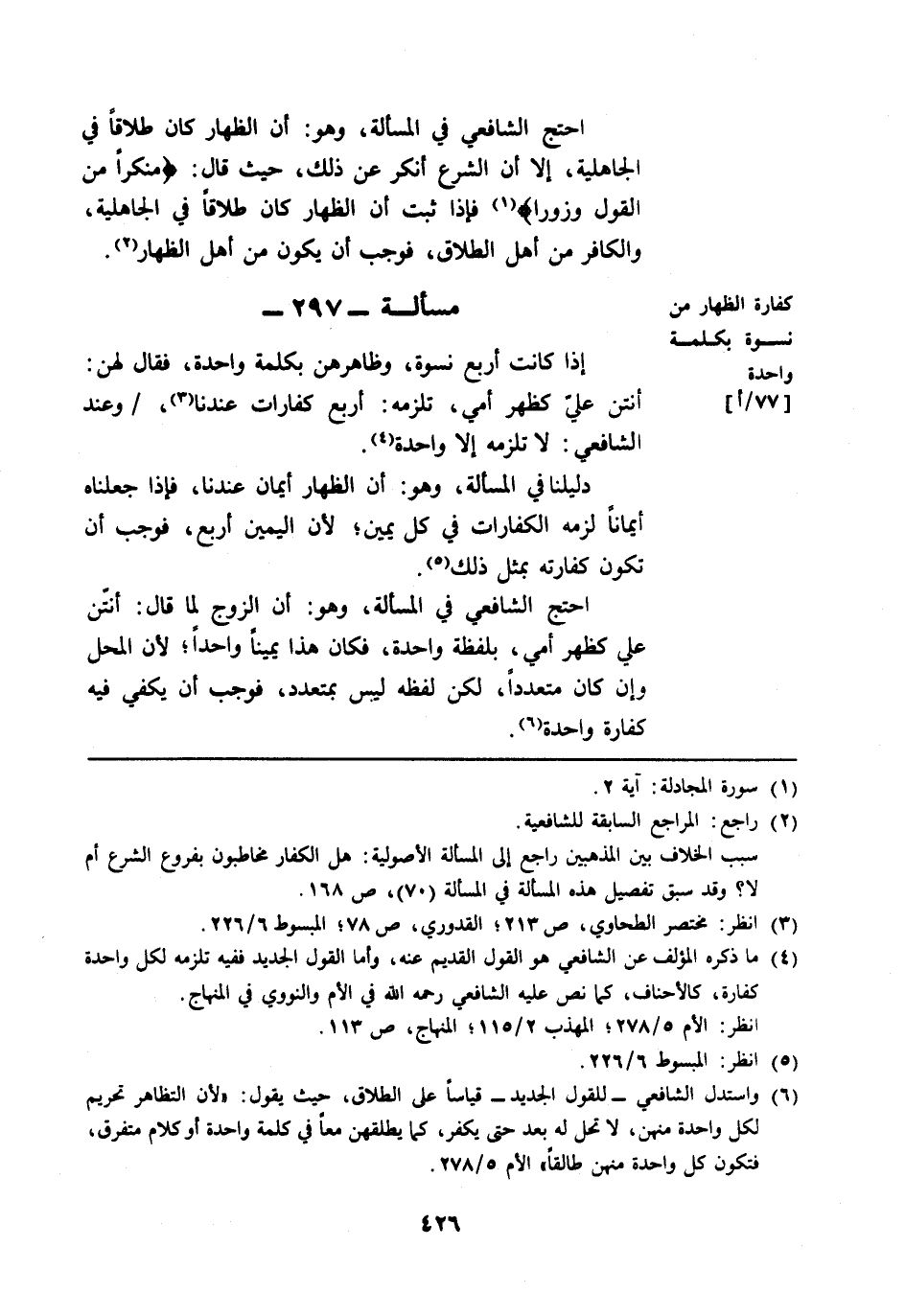(¬6) واستدل الشافعي - للقول الجديد - قياسًا على الطلاق، حيث يقول: "لأن التظاهر تحريم لكل واحدة منهن، لا تحل له بعد حتى يكفر، كلا يطلقهن معًا في كلمة واحدة أو كلام متفرق، فتكون كل واحدة منهن طالقًا" الأم 5/ 278.