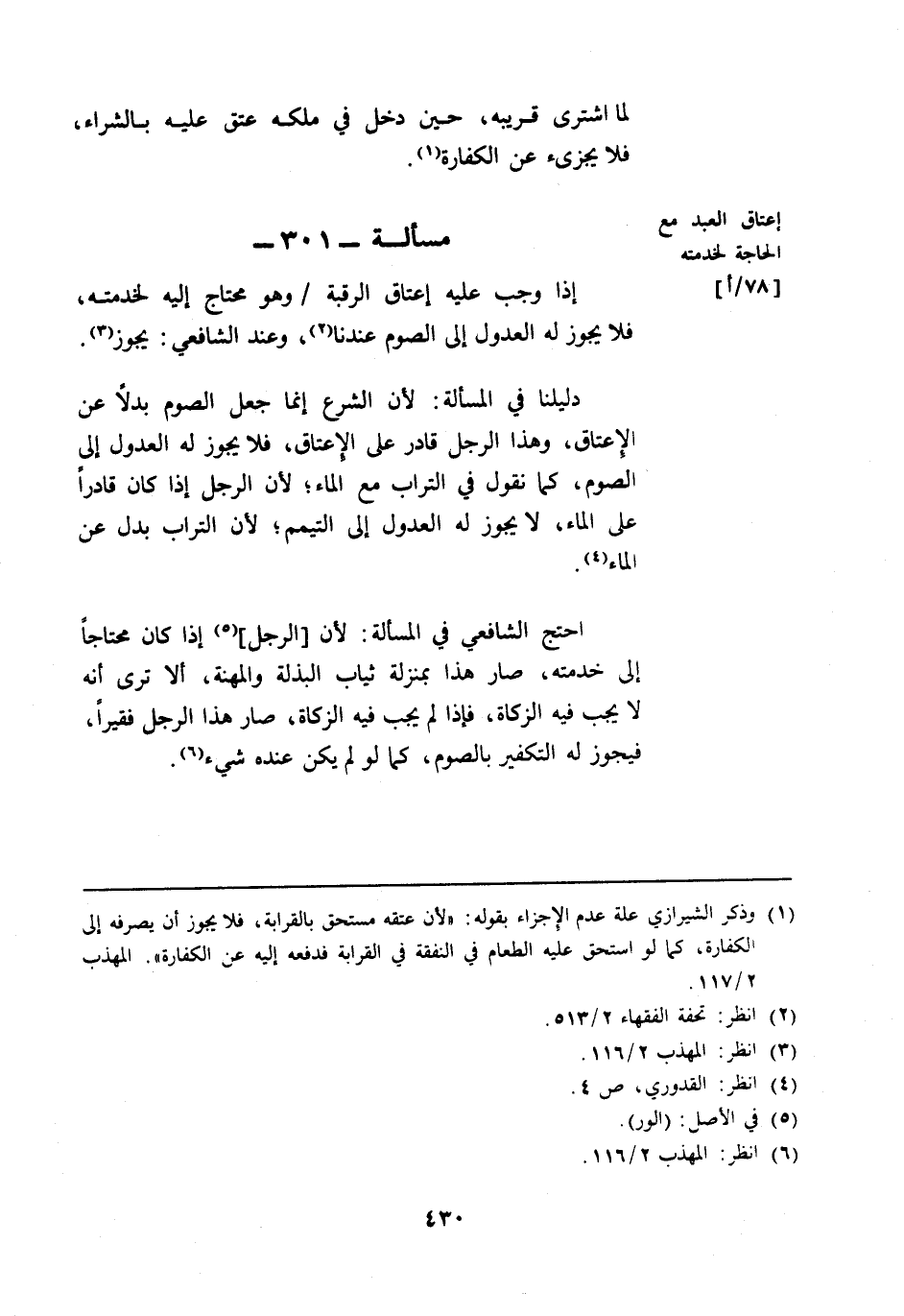 مسألة: 301 - إعتاق العبد مع الحاجة لخدمته