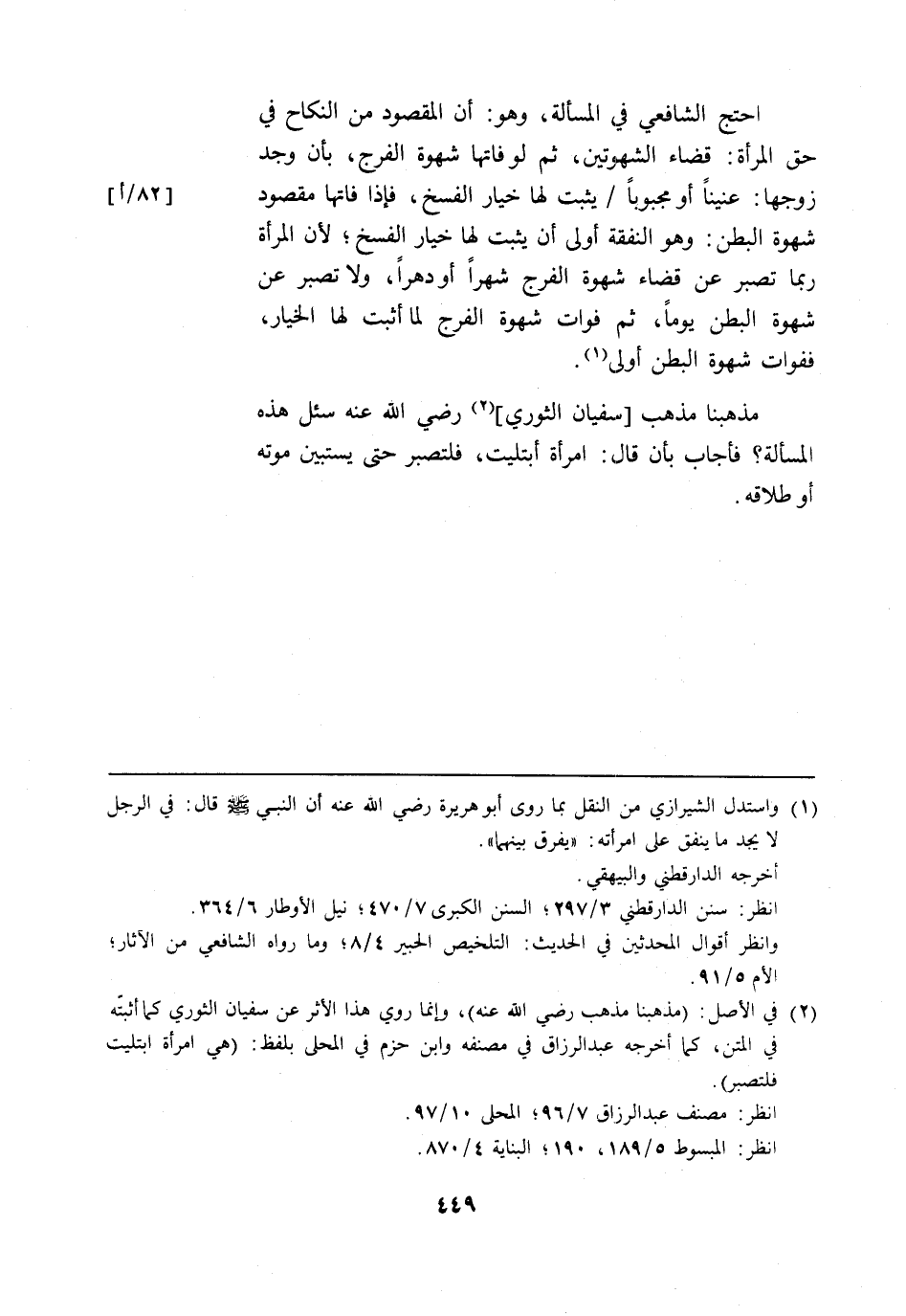 (¬2) في الأصل: (مذهبنا مذهب رضي الله عنه)، وإنما روي هذا الأثر عن سفيان الثوري كما أثبتّه في المتن، كما أخرجه عبد الرزاق في مصنفه وابن حزم في المحلي بلفظ: (هي امرأة ابتليت فلتصبر).