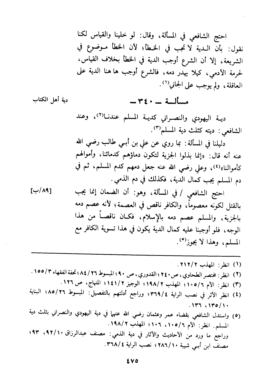 احتج الشافعي في المسألة، وهو: أن الضمان إنما يجب بالقتل لكونه معصومًا، والكافر ناقص في العصمة؛ لأنه عصم دمه بالجزية، والمسلم عصم دمه بالإِسلام، فكان ناقصًا من هذا الوجه، فلو أوجبنا عليه كمال الدية يكون في هذا تسوية الكافر مع المسلم، وهذا لا يجوز (¬5).