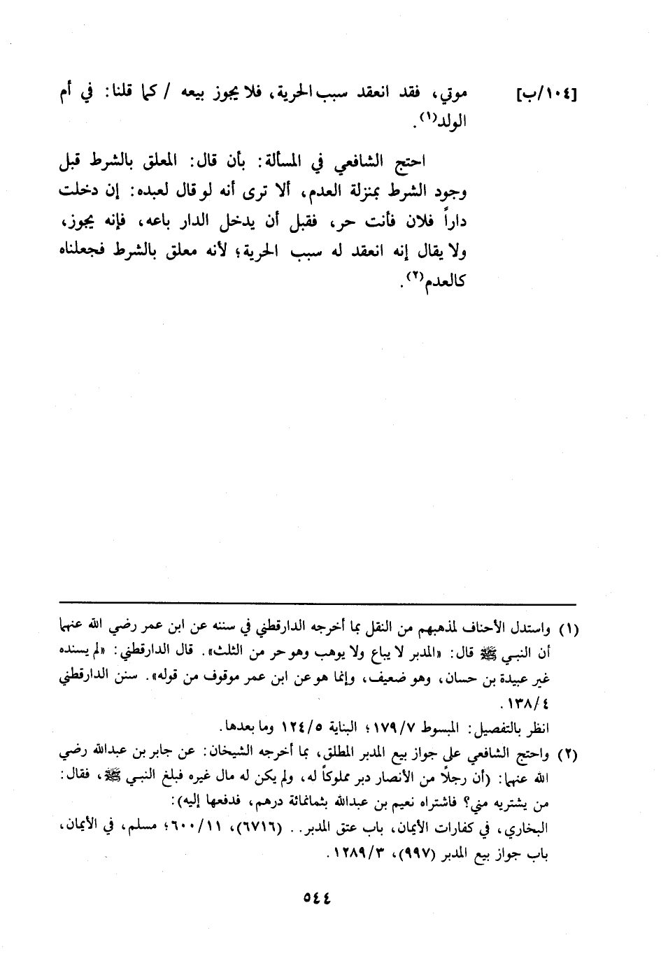 (¬2) واحتج الشافعي على جواز بيع المدبر المطلق، بما أخرجه الشيخان: عن جابر بن عبد الله رضي الله عنهما: (أن رجلًا من الأنصار دبر مملوكًا له، ولم يكن له مال غيره فبلغ النبي - صلى الله عليه وسلم -، فقال: من يشتريه مني؟ فاشتراه نعيم بن عبد الله بثمانمائة درهم، فدفعها إليه):