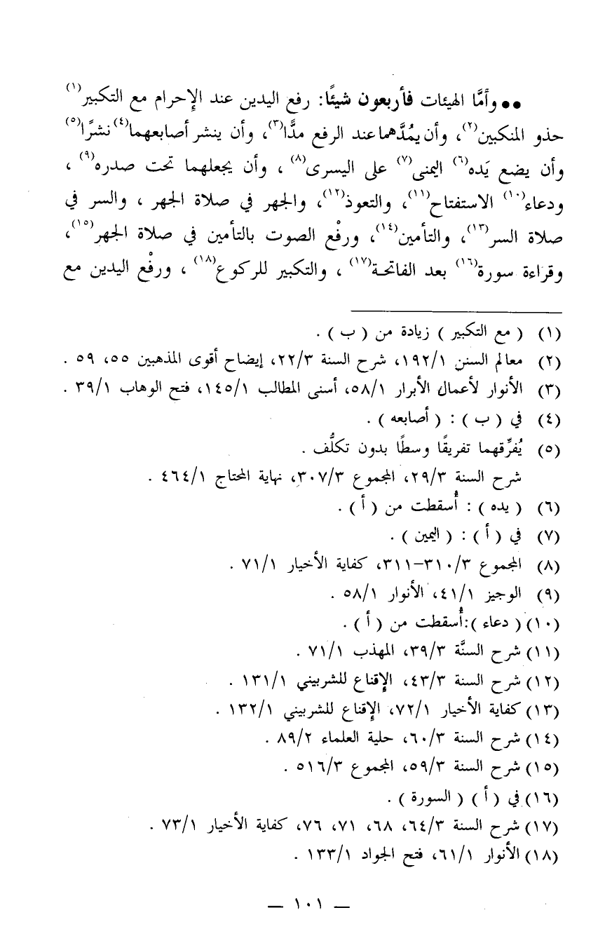 وأما الهيئات فأربعون شيئا: رفع اليدين عند الإحرام مع التكبير1 حذو المنكبين2، وأن يمدهما عند الرفع مدّا3، وأن ينشر أصابعهما4 نشرا5 وأن يضع يده6 اليمنى7 على اليسرى8، وأن يجعلهما تحت صدره9، ودعاء10 الاستفتاح11، والتعوذ12، والجهر في صلاة الجهر، والسر في صلاة السر13، والتأمين14، ورفع الصوت بالتأمين في صلاة الجهر15، وقراءة سورة16 بعد الفاتحة17، والتكبير للركوع18، ورفع اليدين مع