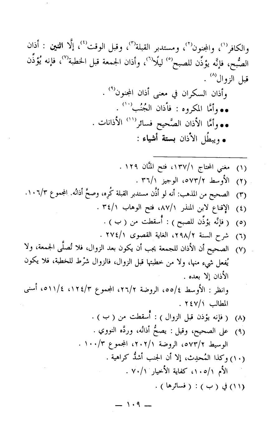 والكافر1، والمجنون2، ومستدبر القبلة3، وقبل الوقت4، إلا اثنين: أذان الصبح، فإنه يؤذن للصبح5 ليلا6، وأذان الجمعة قبل الخطبة7، فإنه يؤذّن قبل الزوال8.