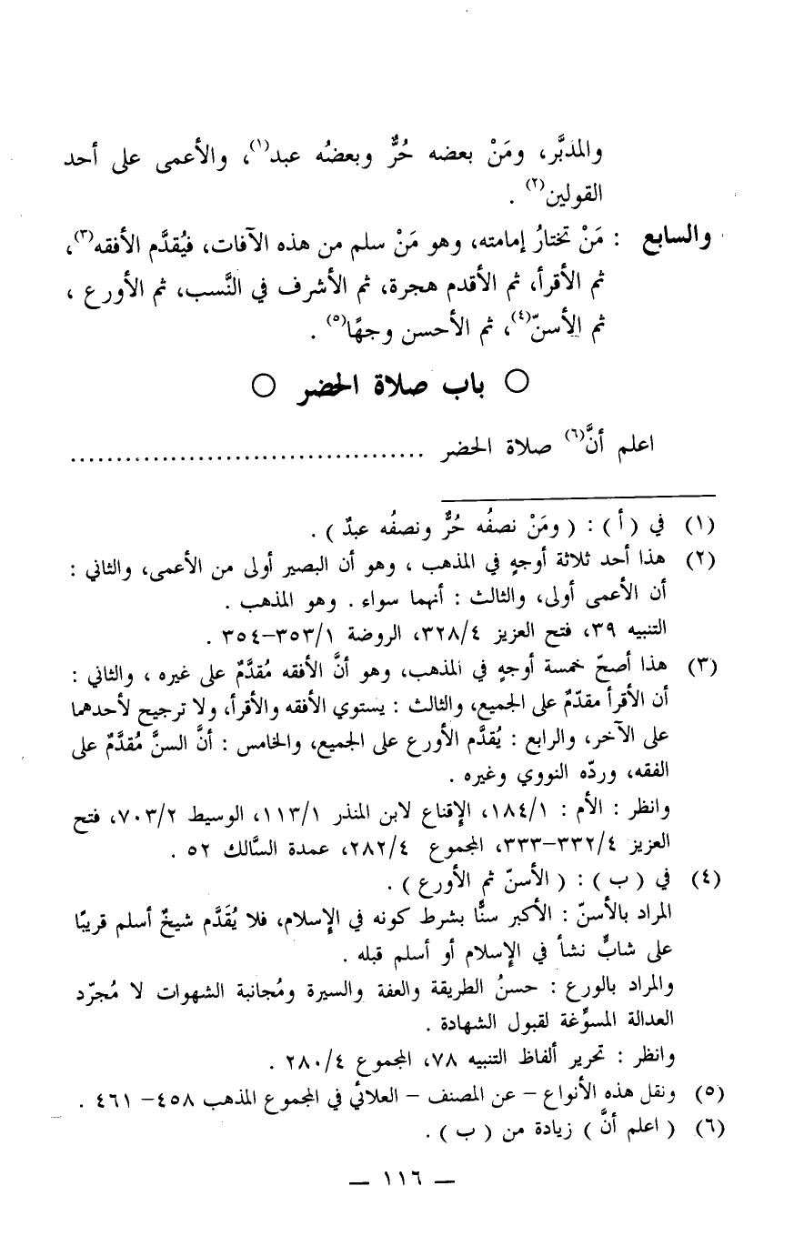 والسابع: من تختار إمامته، وهو من سلم من هذه الآفات، فيُقَدَّم الأفقه3، ثم الأقرأ، ثم الأقدم هجرة، ثم الأشرف في النسب، ثم الأورع، ثم الأسنّ4، ثم الأحسن وجها5.