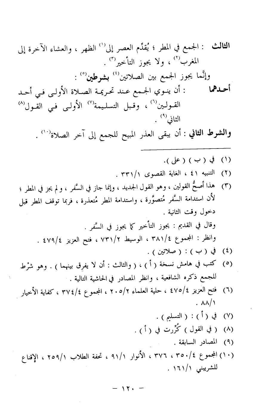 5 كتب في هامش نسخة (أ) ، (والثالث: أن لا يفرق بينهما) . وهو شرط للجمع ذكره الشافعية، وانظر المصادر في الحاشية التالية.