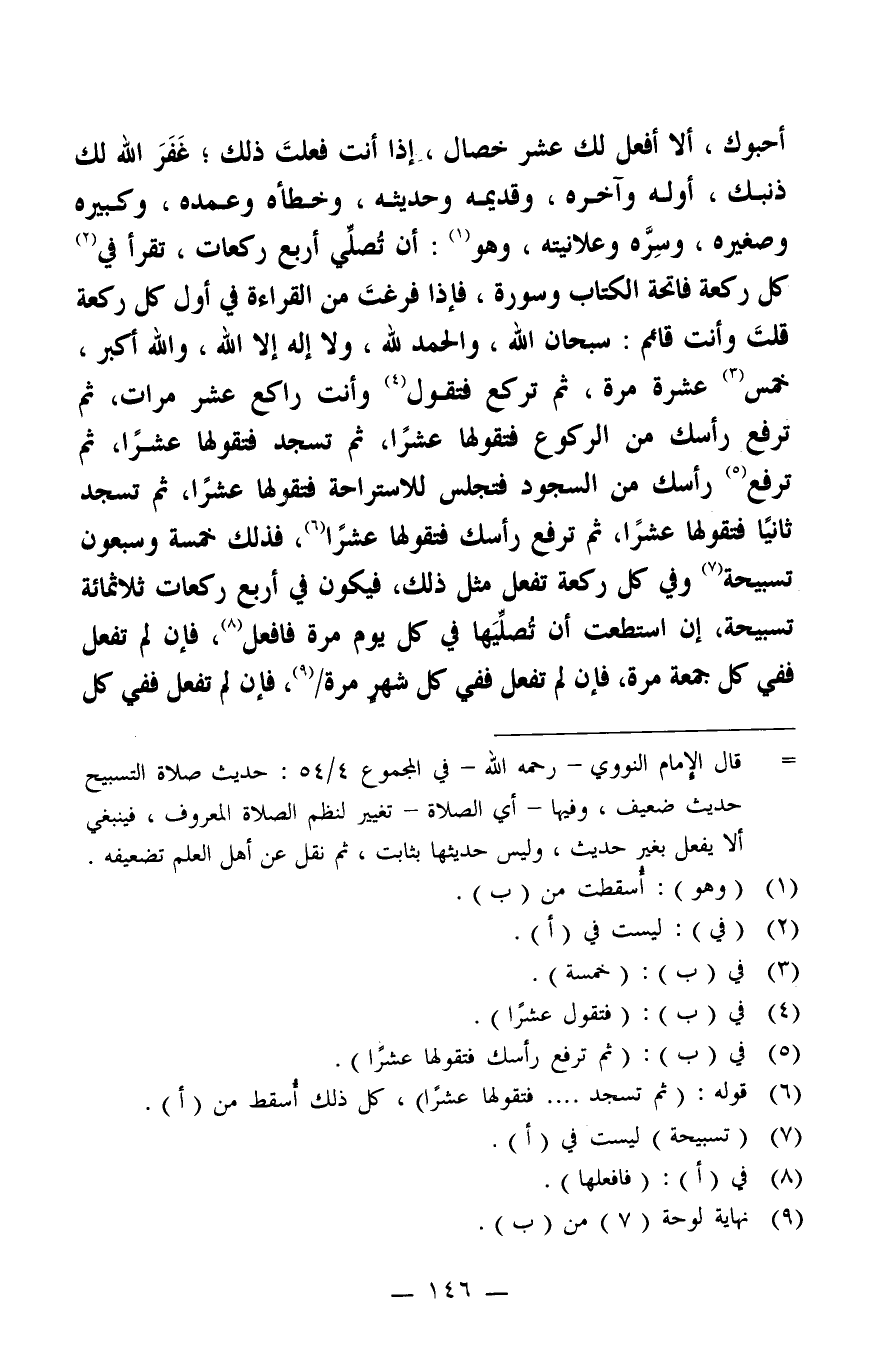 أحبوك، ألا أفعل لك عشر خصال، إذ أنت فعلتَ ذلك، غفر الله لك ذنبك، أوله وآخره، وقديمه وحديثه، وخطأه وعمده، وكبيره وصغيره، وسرّه وعلانيته، وهو1: أن تصلّي أربع ركعات، تقرأ في2 كل ركعة فاتحة الكتاب وسورة، فإذا فرغت من القراءة في أول كل ركعة قلت وأنت قائم: سبحان الله، والحمد لله، ولا إله إلا الله، والله أكبر، خمس3 عشرة مرة، ثم تركع فتقول4 وأنت راكع عشر مرات، ثم ترفع رأسك من الركوع فتقولها عشرا، ثم تسجد فتقولها عشرا، ثم ترفع5 رأسك من السجود فتجلس للاستراحة فتقولها عشرا، ثم تسجد ثانيا فتقولها عشرا، ثم ترفع رأسك فتقولها عشرا6، فذلك خمسة وسبعون تسبيحة7 وفي كل ركعة تفعل مثل ذلك، فيكون في أربع ركعات ثلاثمائة تسبيحة، إن استطعت أن تصليها في كل يوم مرة فافعل8، فإن لم تفعل ففي كل جمعة مرة، فإن لم تفعل ففي كل شهر مرة /9، فإن لم تفعل ففي كل