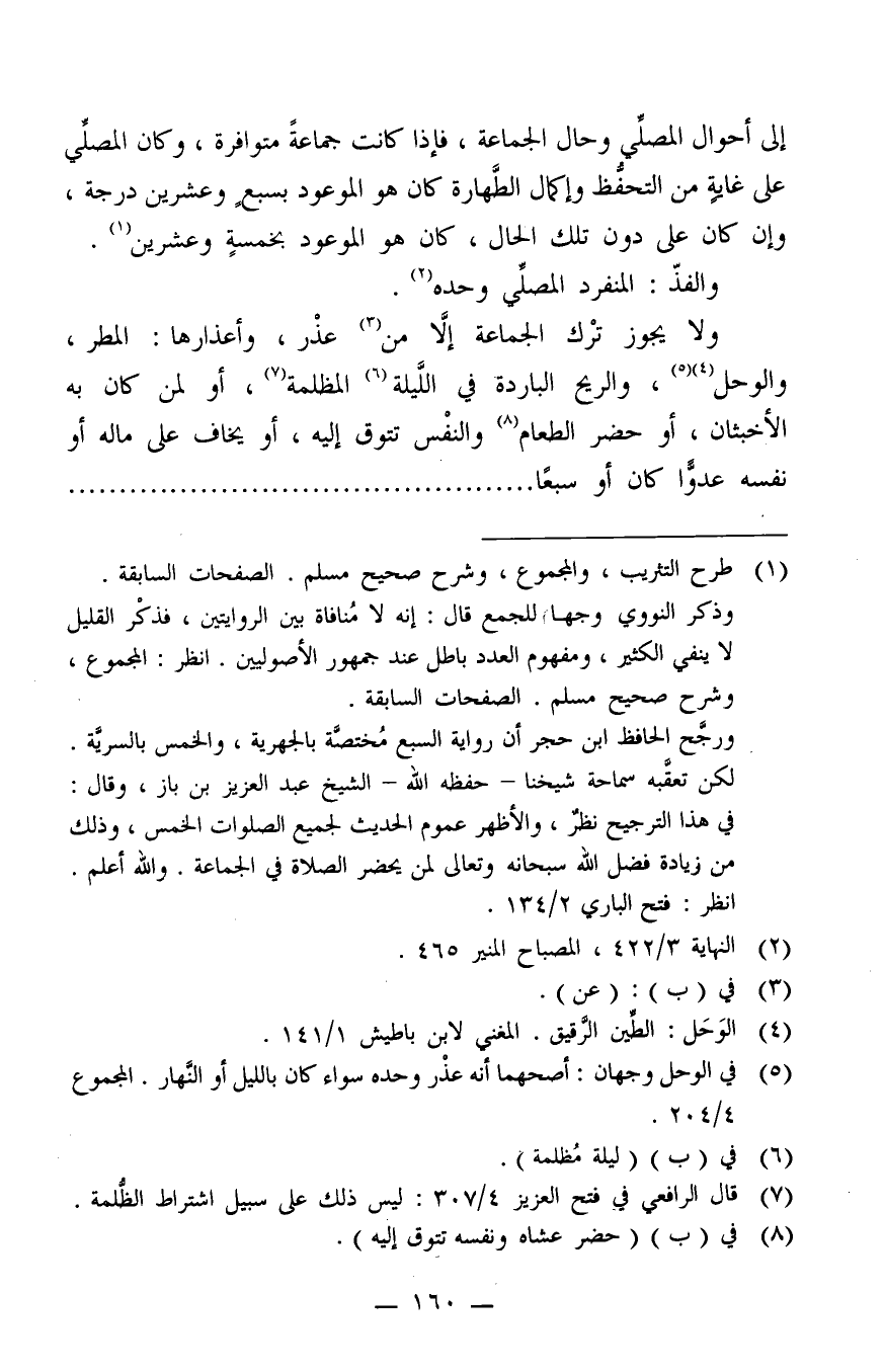 ولا يجوز ترك الجماعة إلا من3 عذر، وأعذارها: المطر، والوحل4 5، والريح الباردة في الليلة6 المظلمة7، أو لمن كان به الأخبثان، أو حضر الطعام8 والنفس تتوق إليه، أو يخاف على ماله أو نفسه عدوّا كان أو سبعا