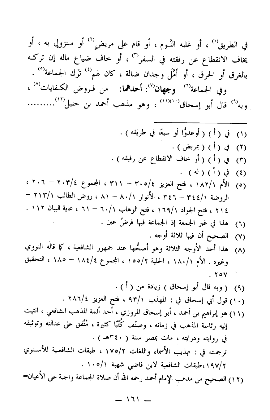 وفي الجماعة6 وجهان 7: أحدهما: من فروض الكفايات8، وبه9 قال أبو إسحاق10 11، وهو مذهب أحمد بن حنبل12