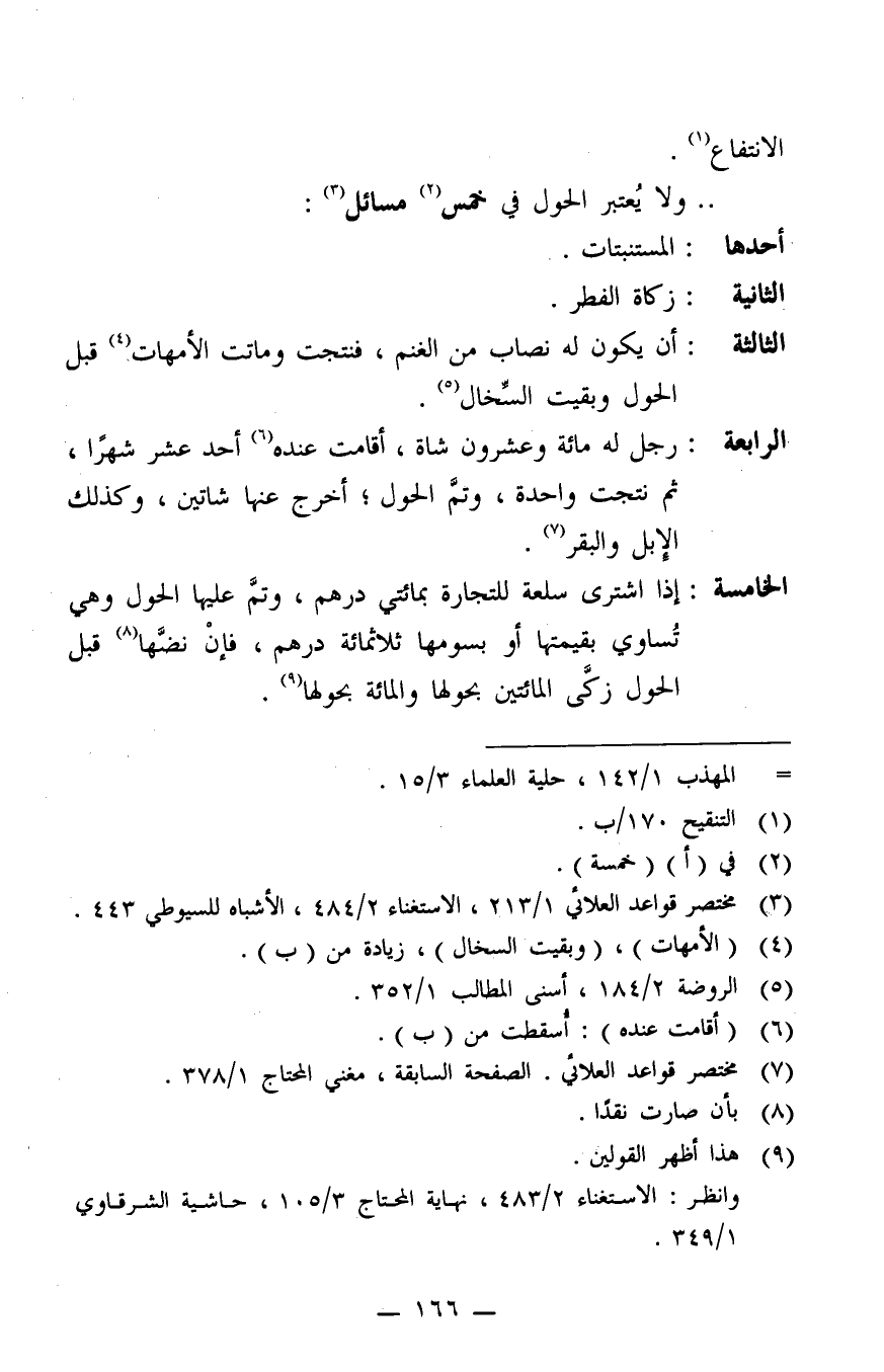 الخامسة: إذا اشترى سلعة للتجارة بمائتي درهم، وتمّ عليها الحول وهي تساوي بقيمتها أو بسومها ثلاثمائة درهم، فإن نضَّها8 قبل الحول زكّى المائتين بحولها والمائة بحولها9.
