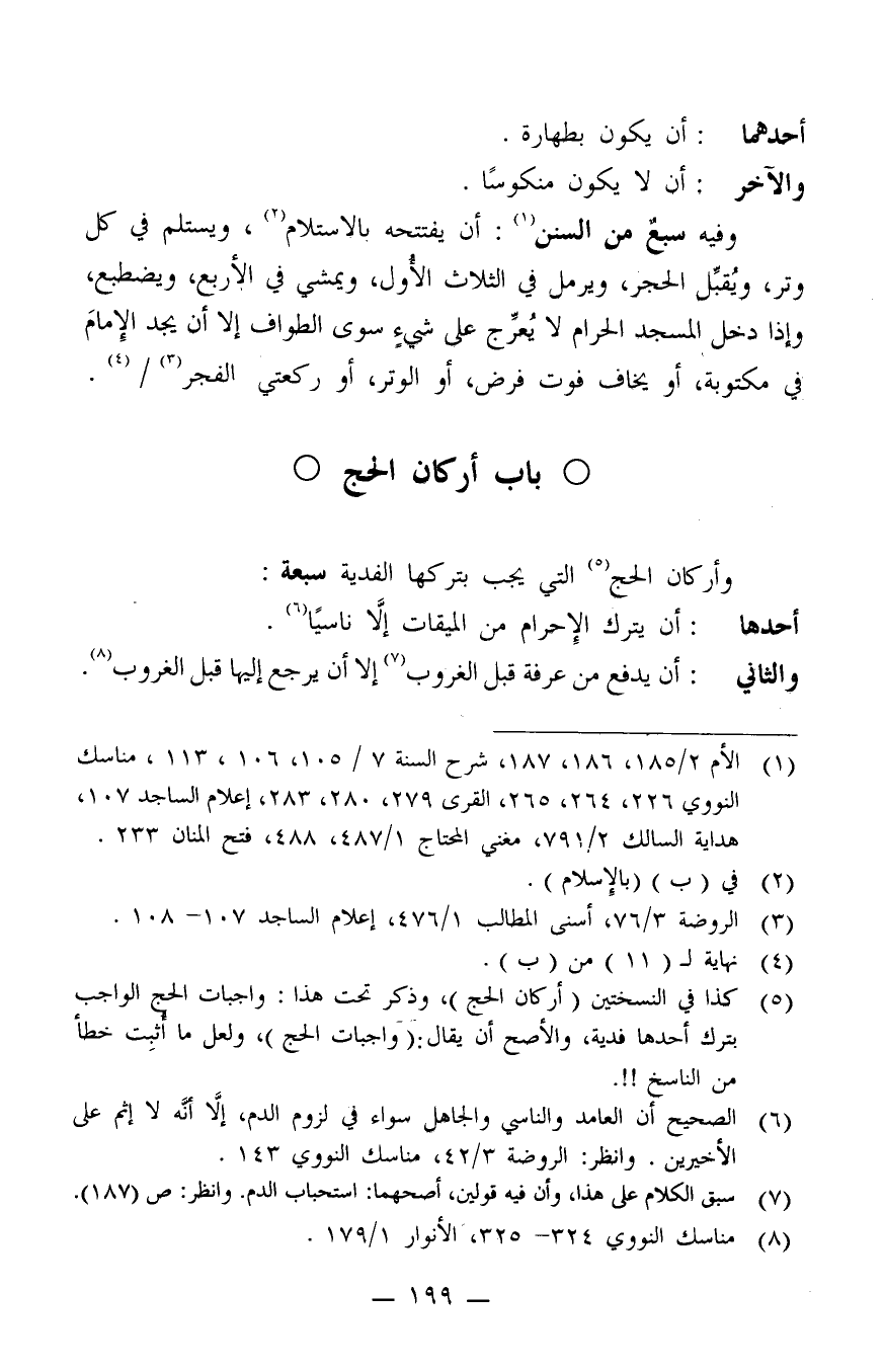 5 كذا في النسختين (أركان الحج) ، وذكر تحت هذا: واجبات الحج الواجب بترك أحدها فدية، والأصح أن يقال: (واجبات الحج) ، ولعل ما أثبت خطأ من الناسخ!!.