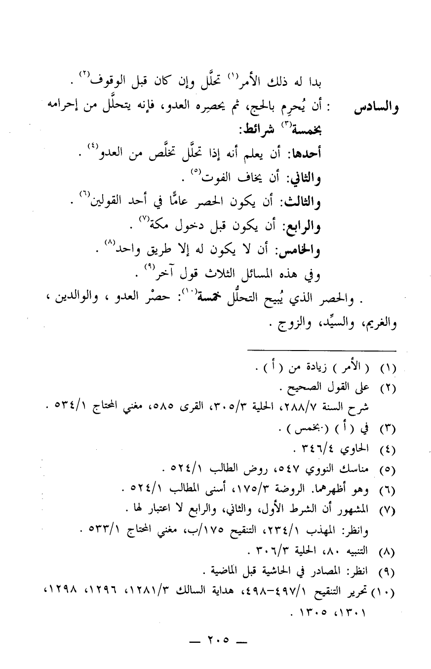 والسادس: أن يحرم بالحج، ثم يحصِره العدو، فإنه يتحلل من إحرامه بخمسة 3 شرائط: