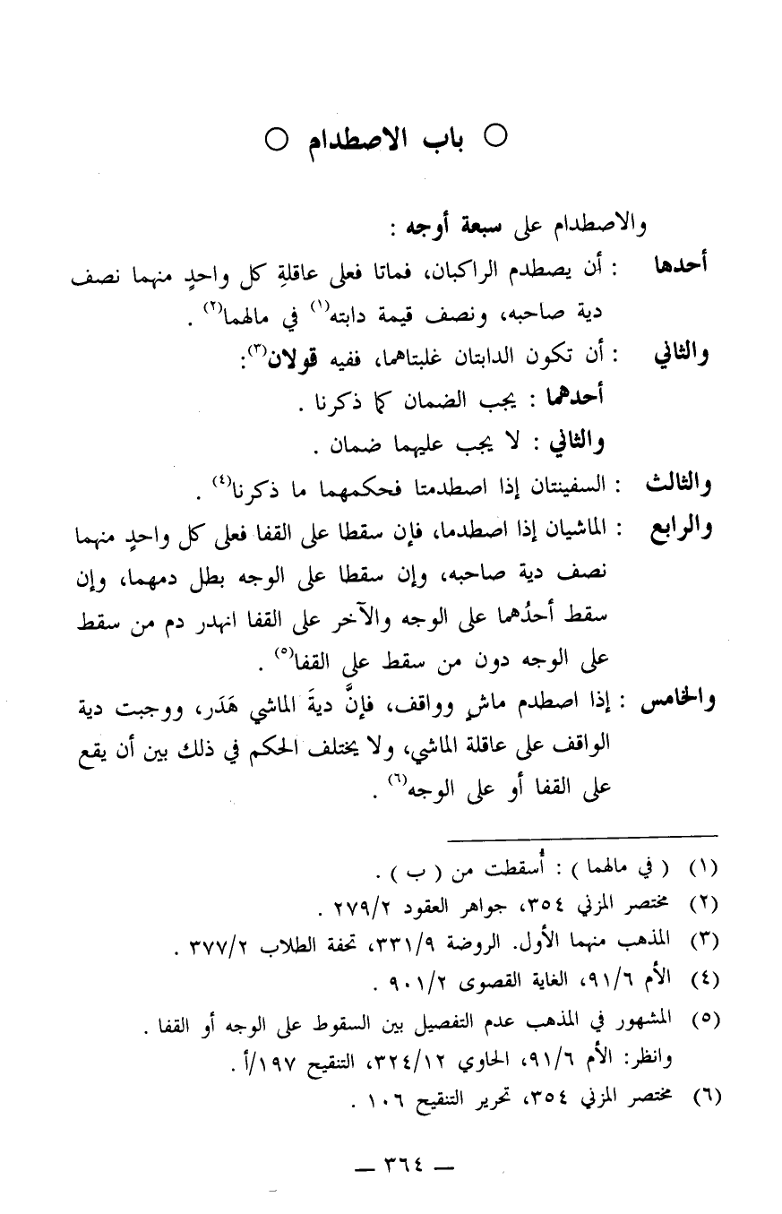 والرابع: الماشيان إذا اصطدما، فإن سقطا على القفا فعلى كل واحد منهما نصف دية صاحبه، وإن سقطا على الوجه بطل دمهما، وإن سقط أحدهما على الوجه والآخر على القفا انهدر دم من سقط على الوجه دون من سقط على القفا5.