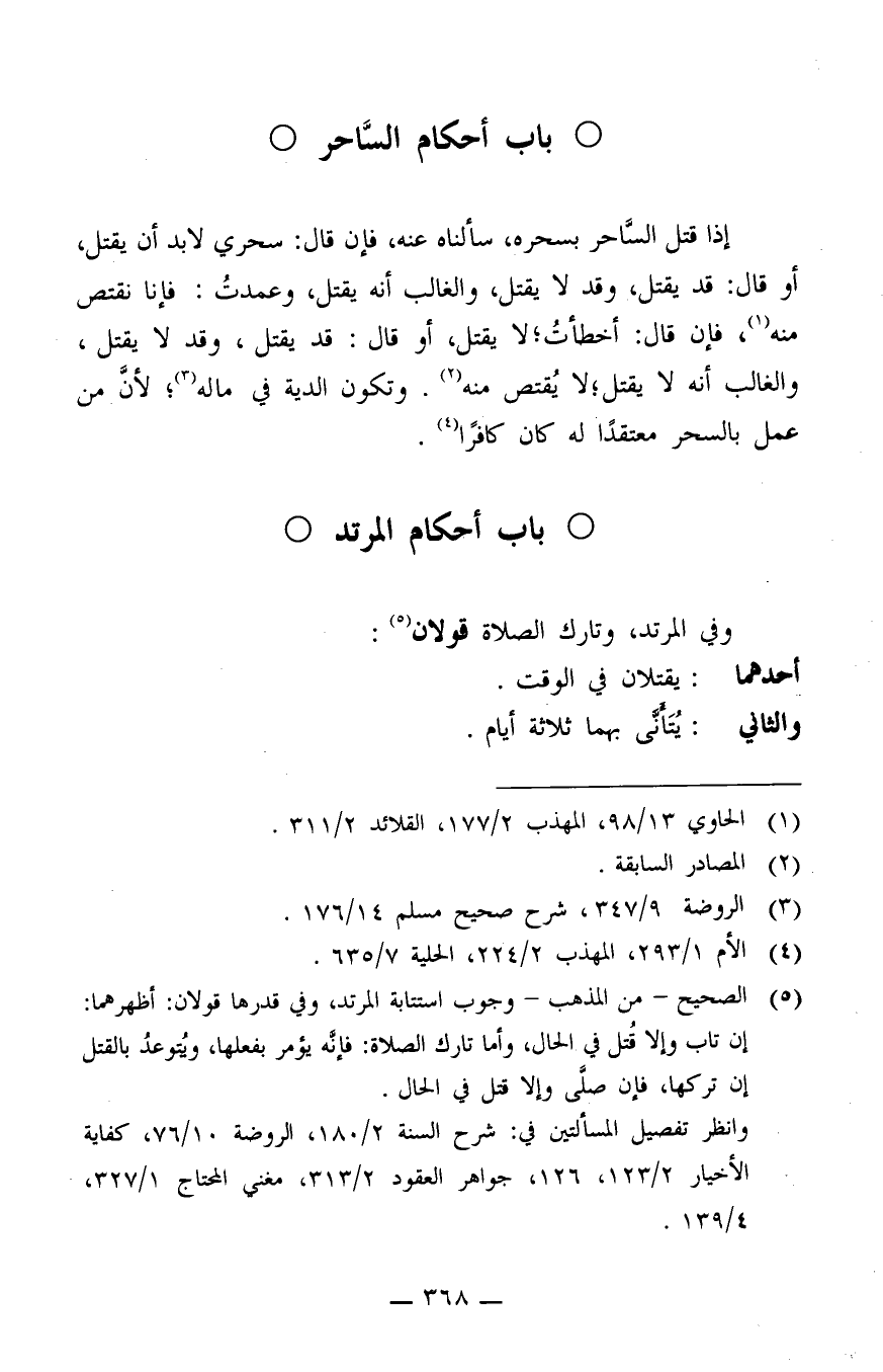 5 الصحيح - من المذهب – وجوب استتابة المرتد، وفي قدرها قولان: أظهرهما: إن تاب وإلا قُتِل في الحال، وأما تارك الصلاة: فإنه يؤمر بفعلها، ويُتوعَّد بالقتل إن تركها، فإن صلى وإلا قتل في الحال.