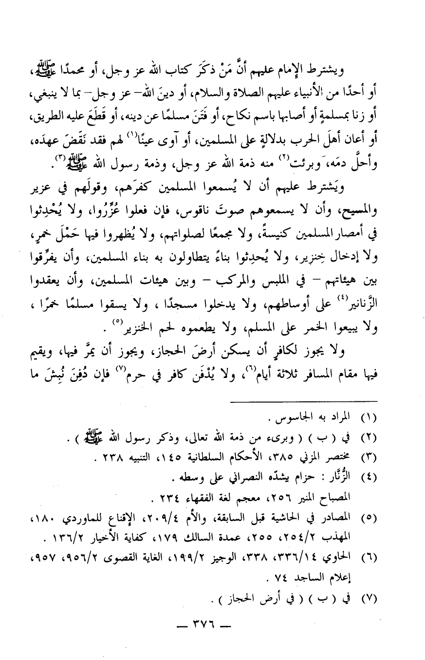 ويشترط عليهم أن لا يُسمعوا المسلمين كفرهم، وقولهم في عزير والمسيح، وأن لا يسمعوهم صوت ناقوس، فإن فعلوا عُزِّروا، ولا يحدثوا في أمصار المسلمين كنيسة، ولا مجمعا لصلواتهم، ولا يُظهروا فيه حمل خمر، ولا إدخال خنزير، ولا يُحدثوا بناء يتطاولون به بناء المسلمين، وأن يفرّقوا بين هيئاتهم – في الملبس والمركب – وبين هيئات المسلمين، وأن يعقدوا الزنانير4 على أوساطهم، ولا يدخلوا مسجدا، ولا يسقوا مسلما خمرا، ولا يبيعوا الخمر على المسلم، ولا يطعموه لحم الخنزير5.