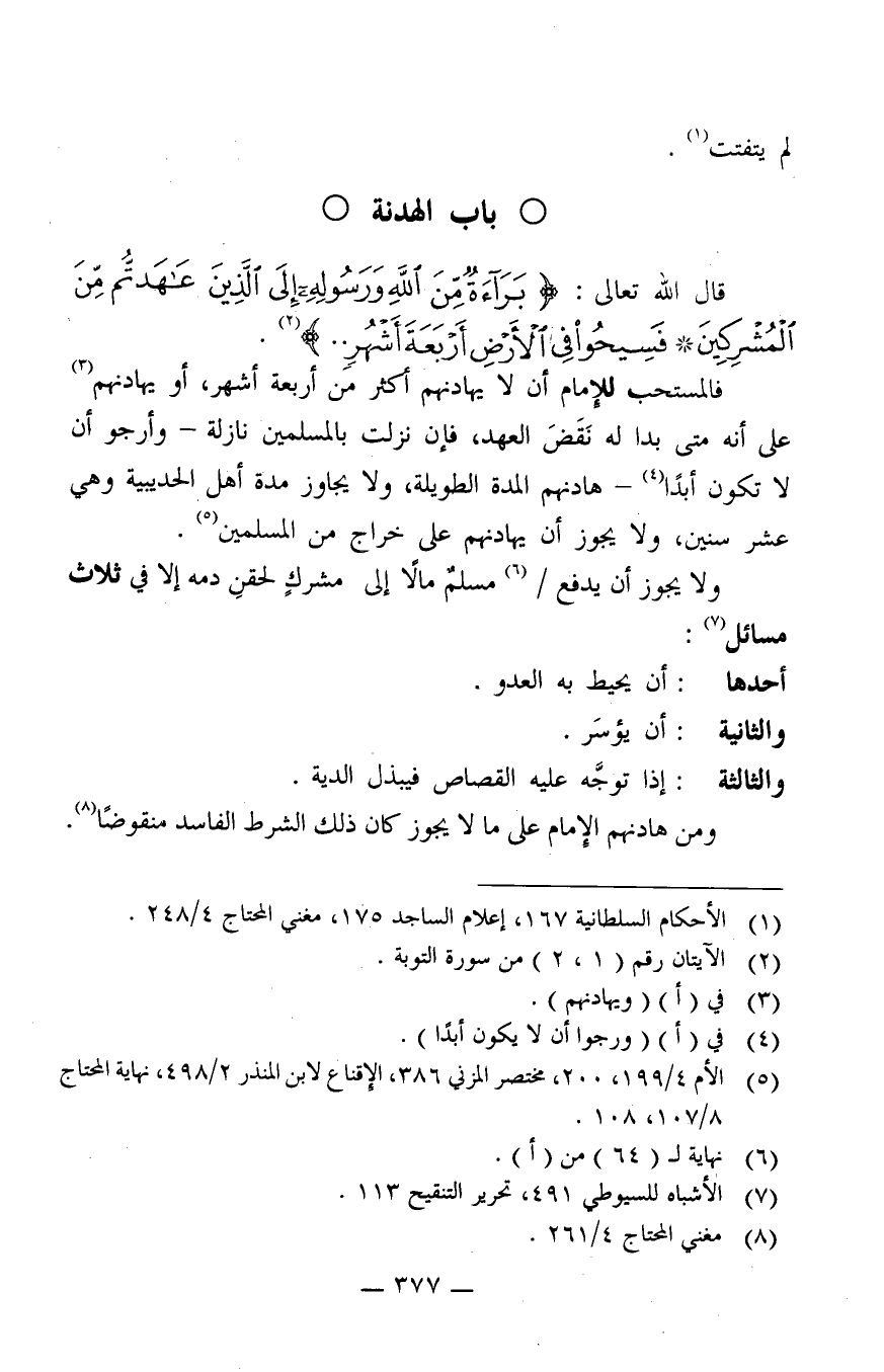 فالمستحب للإمام أن لا يهادنهم أكثر من أربعة أشهر، أو يهادنهم3 على أنه متى بدا له نقَضَ العهد، فإن نزلت بالمسلمين نازلة – وأرجوا أن لا تكون أبدا4 – هادنهم المدة الطويلة، ولا يجاوز مدة أهل الحديبية وهي عشر سنين، ولا يجوز أن يهادنهم على خراج من المسلمين5.