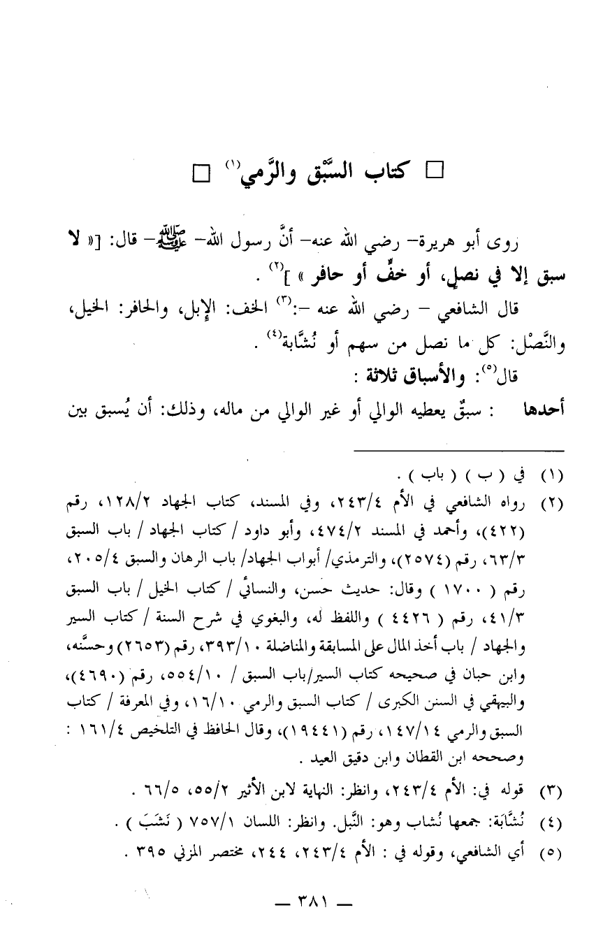 2 رواه الشافعي في الأم 4/243، وفي المسند، كتاب الجهاد 2/128، رقم (422) ، وأحمد في المسند 2/474، وأبو داود / كتاب الجهاد / باب السبق 3/63، رقم (2574) ، والترميذي / أبواب الجهاد / باب الرهان والسبق 4/205، رقم (1700) وقال حديث حسن، والنسائي / كتاب الخيل / باب السبق 3/41، رقم (4426) واللفظ له، والبغوي في شرح السنة / كتاب السير والجهاد / باب أخذ المال على المسابقة والمناضلة 10/393، رقم (2653) وحسّنه، وابن حبان في صحيحه كتاب السير / باب السبق / 10/554، رقم (4690) ، والبيهقي في السنن الكبرى / كتاب السبق والرمي 10/16، وفي المعرفة / كتاب السبق والرمي 14/147، رقم (19441) ، وقال الحافظ في التلخيص 4/161: "وصححه ابن القطان وابن دقيق العيد".